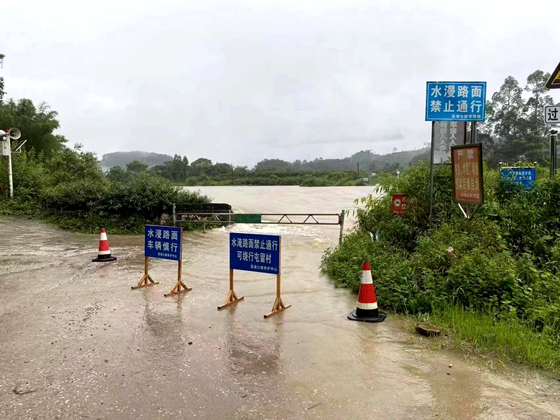 2022年6月17日10时20分,受强降雨影响S206线(荔浦至廉江公路)K11+450-K11+550段(荔浦市茶城乡过村村)过水路段因上游河水上涨,水淹路面深度约0.8米,导致交通中断,过往车辆可绕行屯留村,现场无滞留车辆。荔浦公路养护中心人员已在水淹路段设置好标志标牌,禁止过往群众通行。因降雨还在持续,预计通车时间6月21日10:20分。(徐 辉)