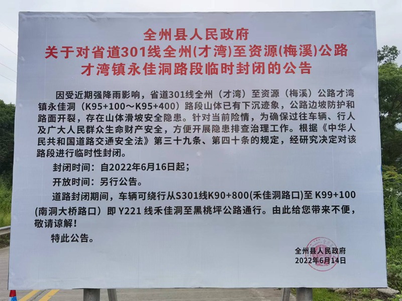 S301线(永安关至龙胜)K95+100~K95+400处全州县才湾镇永佳洞村因持续强降雨导致该路段左侧边坡发生较大位移,触发自动监测红色预警,威胁到交通行车安全,经全州县人民政府批准,于2022年6月16日17时50分对该路段进行封闭。道路封闭期间,车辆可绕行S301线K90+800(禾佳洞路口)至K99+100(南洞大桥路口)即Y221线禾佳洞至黑桃坪公路通行。现场暂无滞留车辆,全州公路养护中心已在该路段设置安全提醒标志,做好排水处置工作,安排值班人员24小时观测监控系统山体位移数据变化,并加强现场巡视,下一步将尽快与相关单位确定处置方案对该路段进行治理。预计恢复通行时间为2022年7月30日。(马家明)