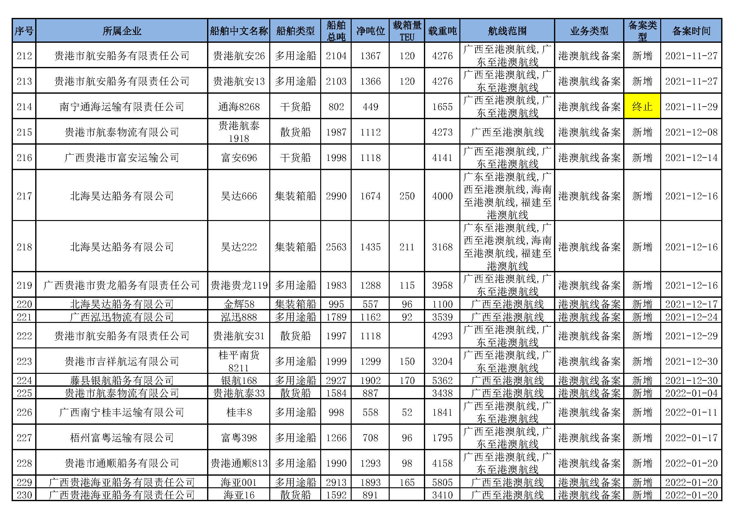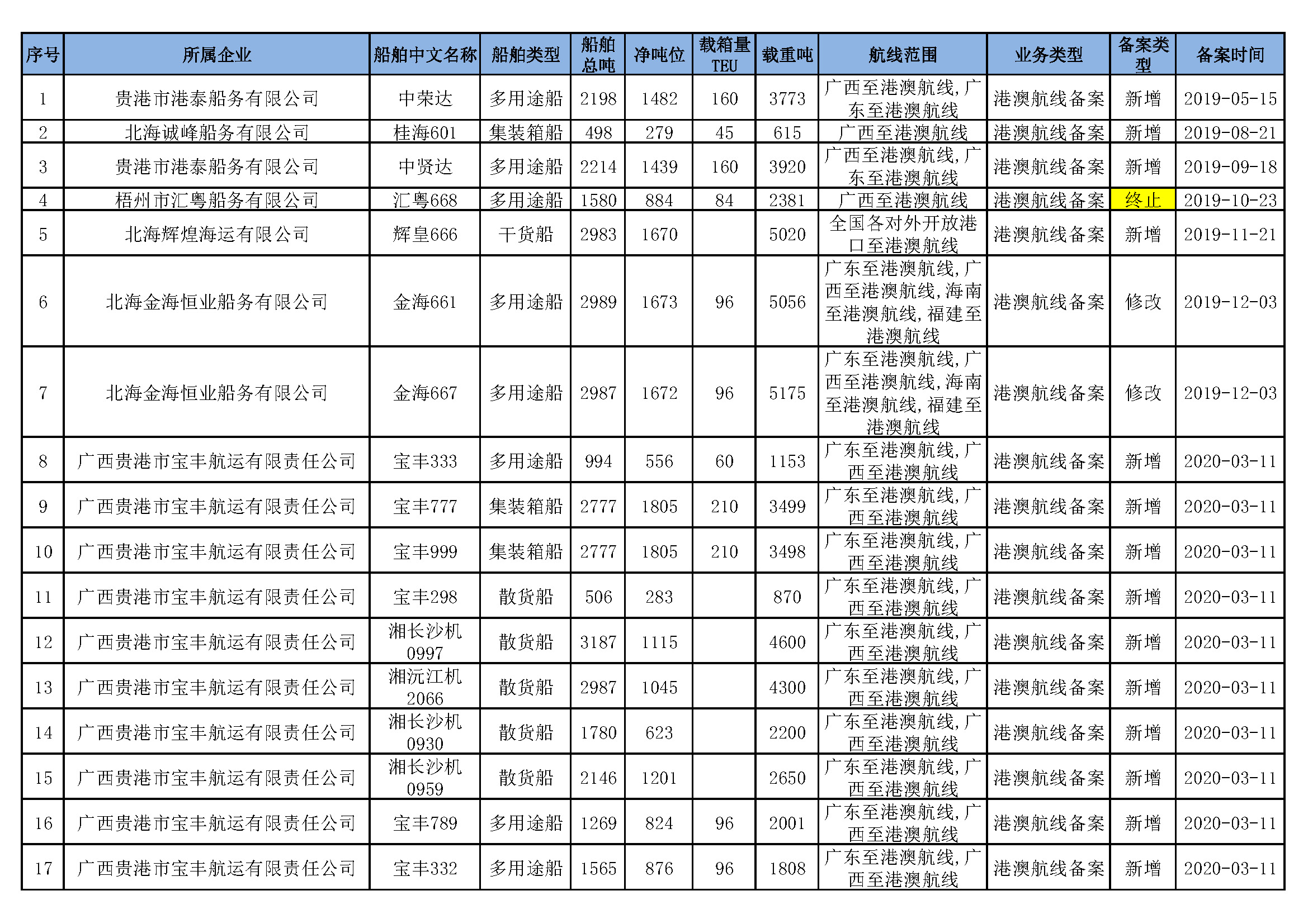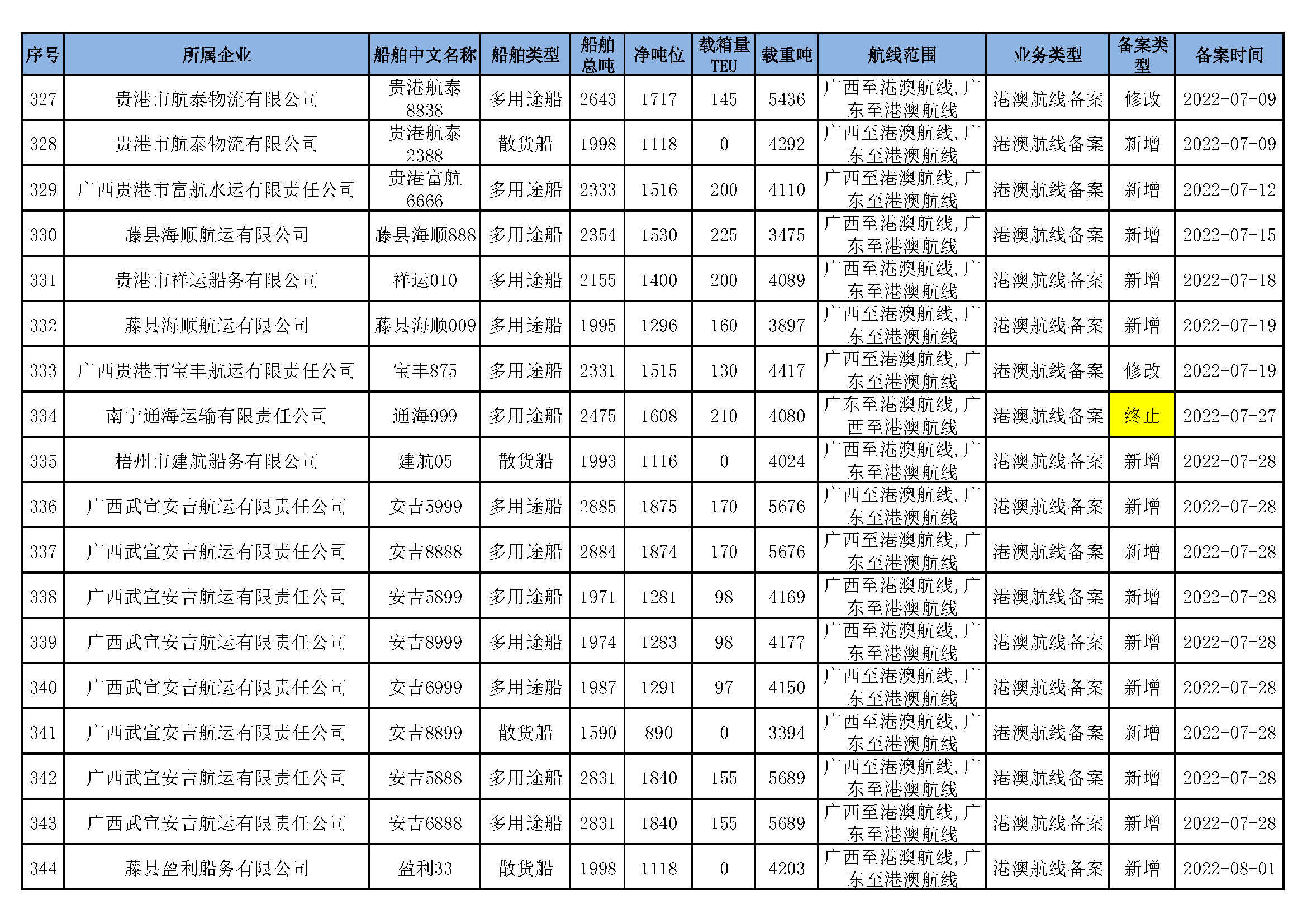截至2022年8月4日在交通运输部水路运输建设综合管理信息系统完成备案的港澳航线水路运输船舶
