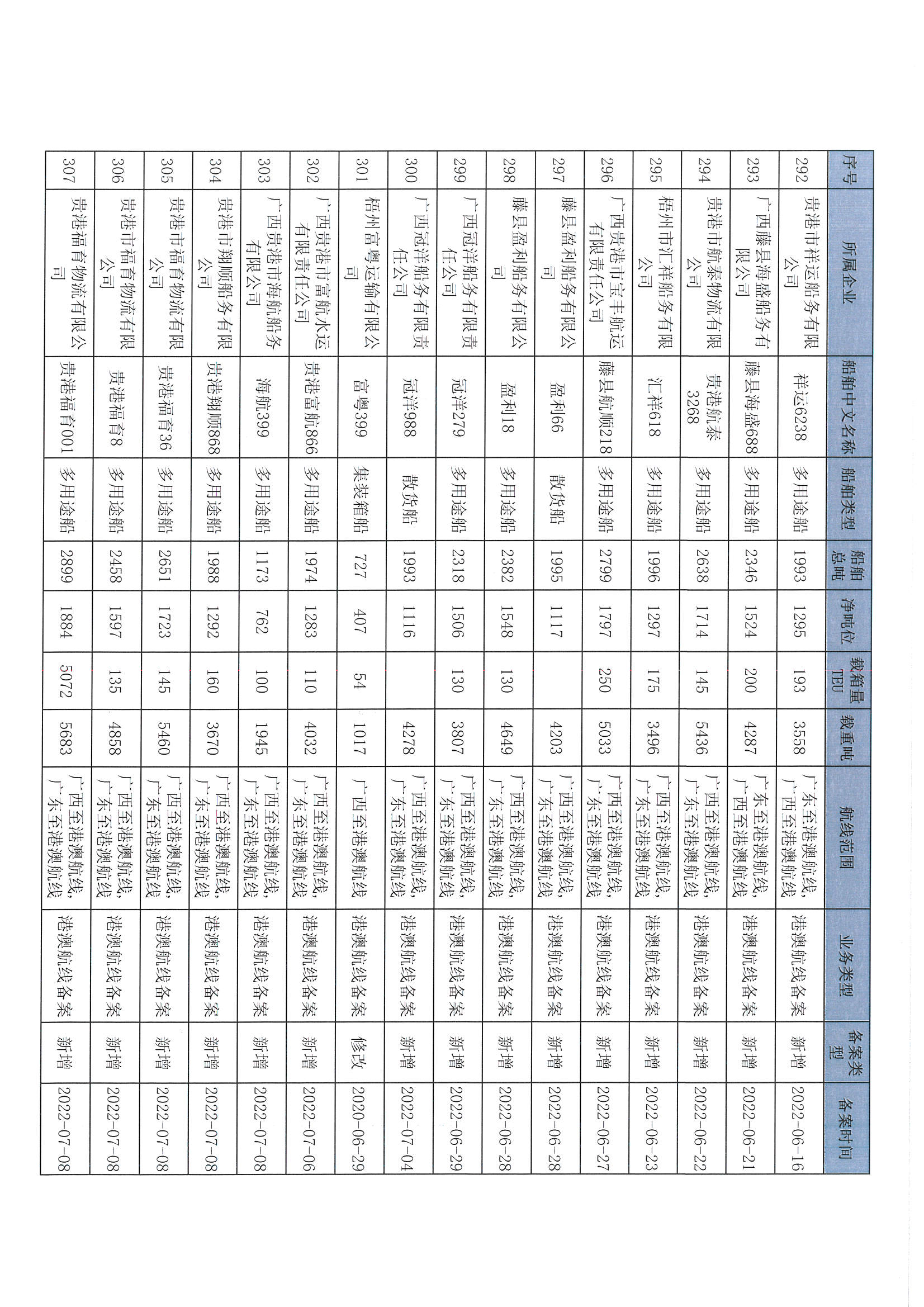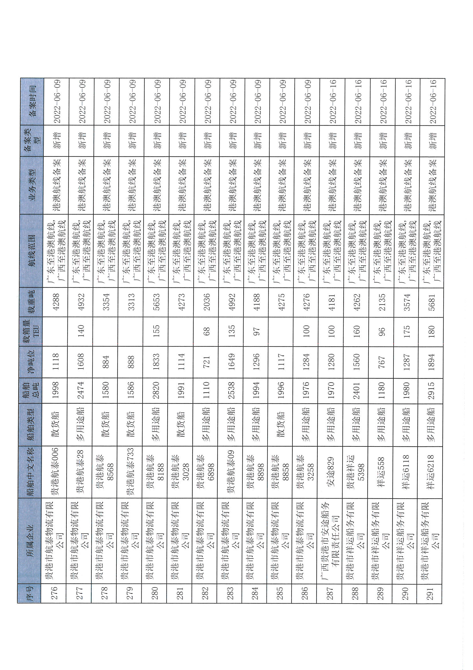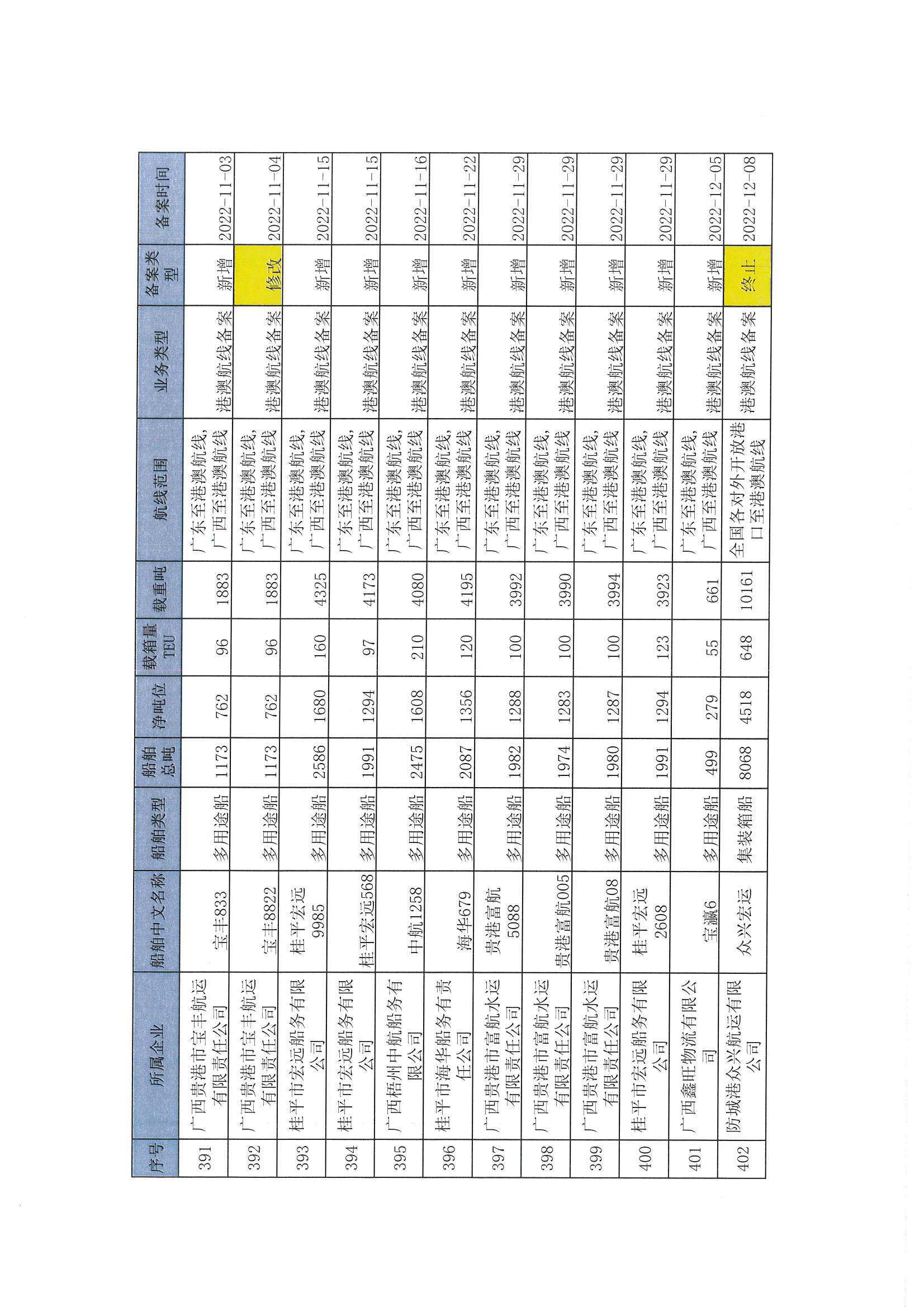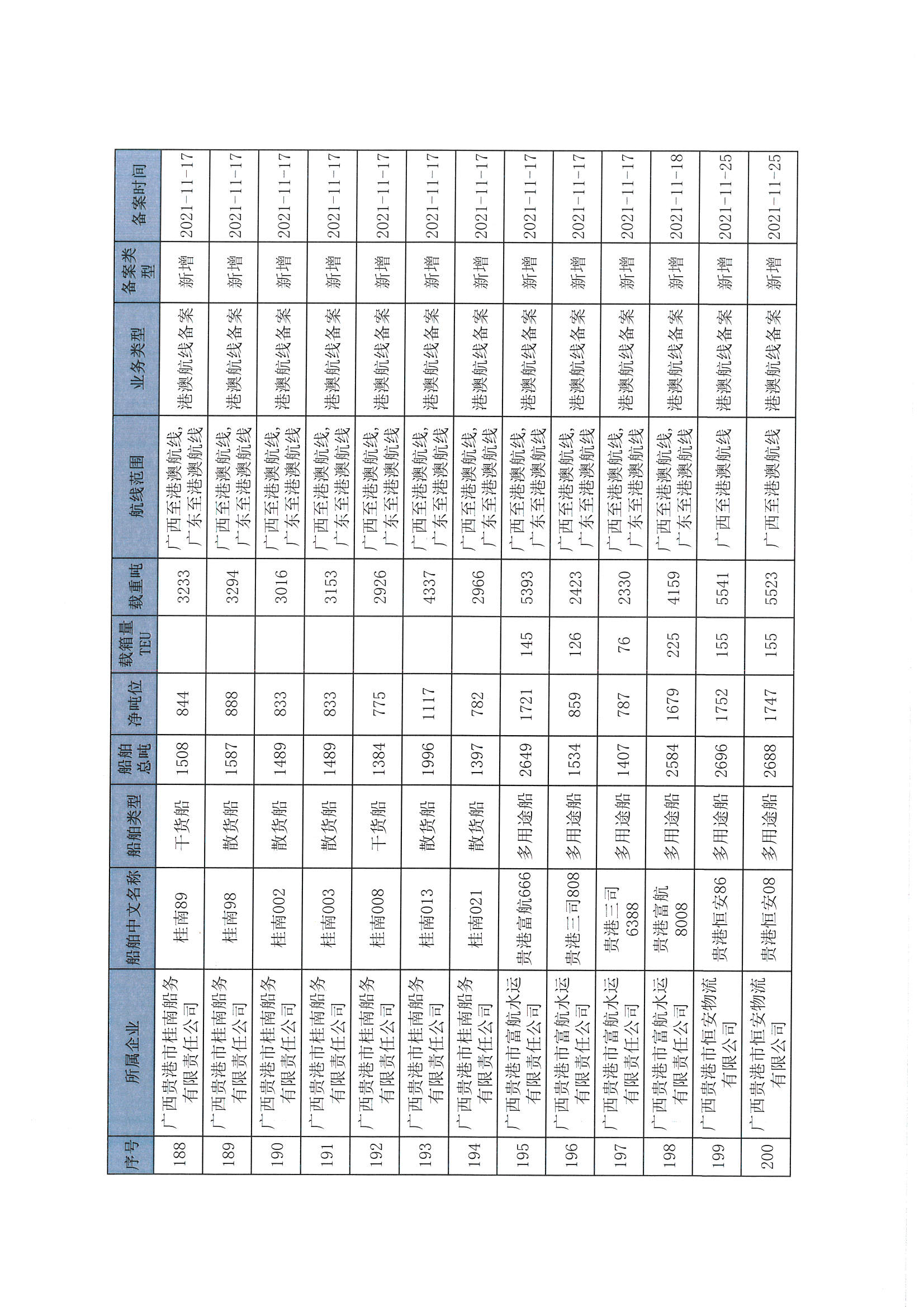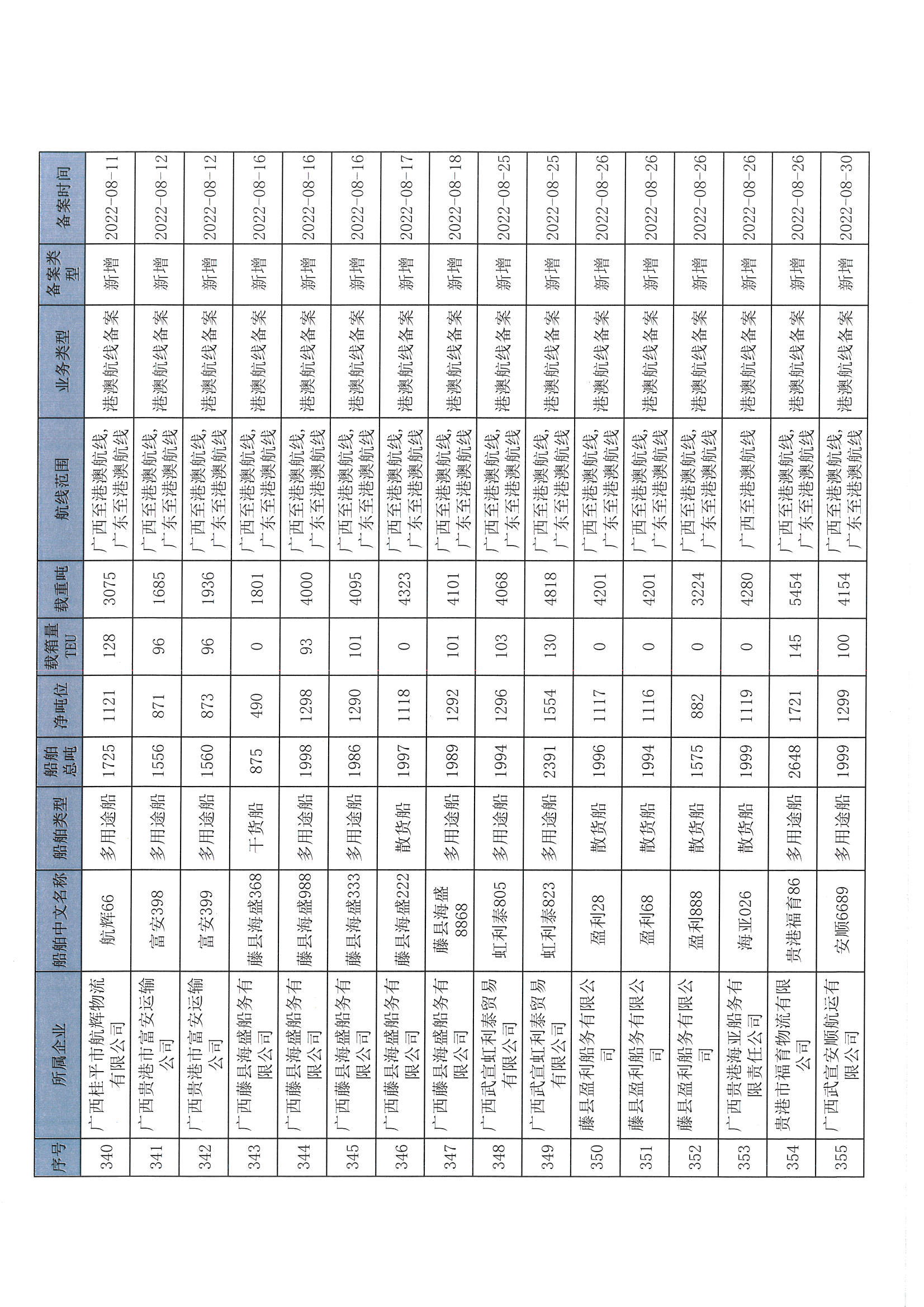 截至2022年12月11日在交通运输部水路运输建设综合管理信息系统完成备案的港澳航线水路运输船舶