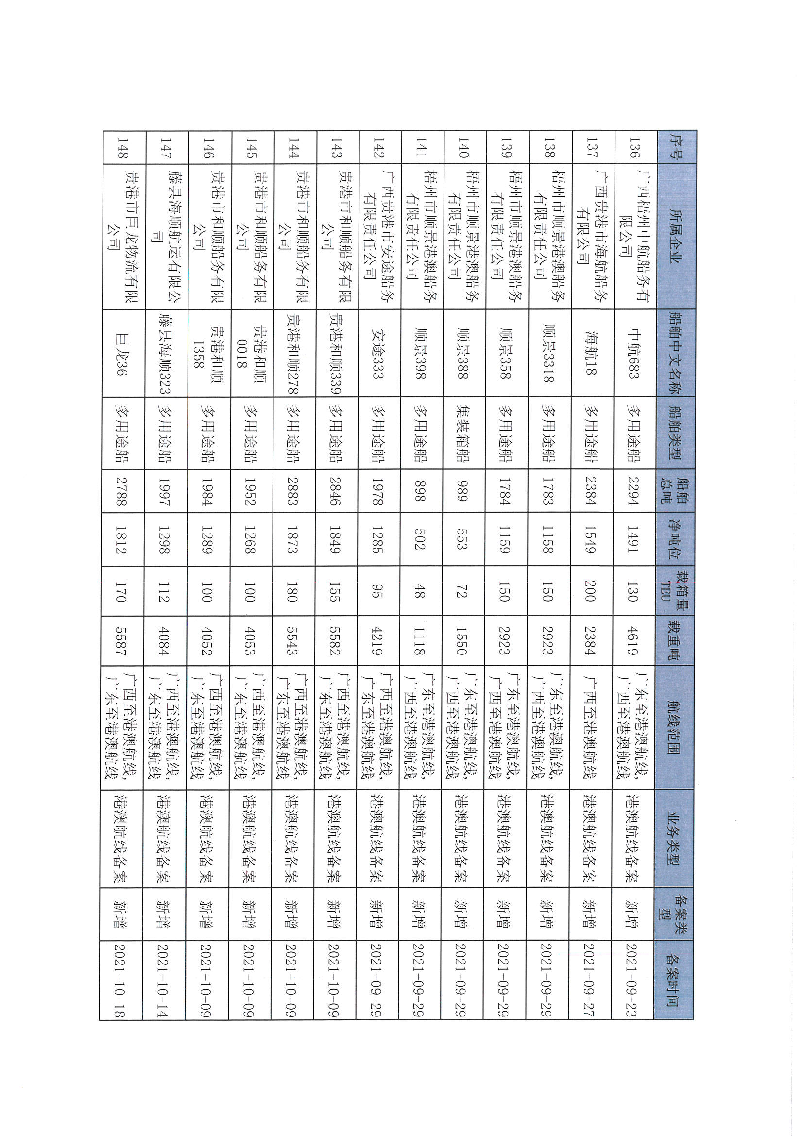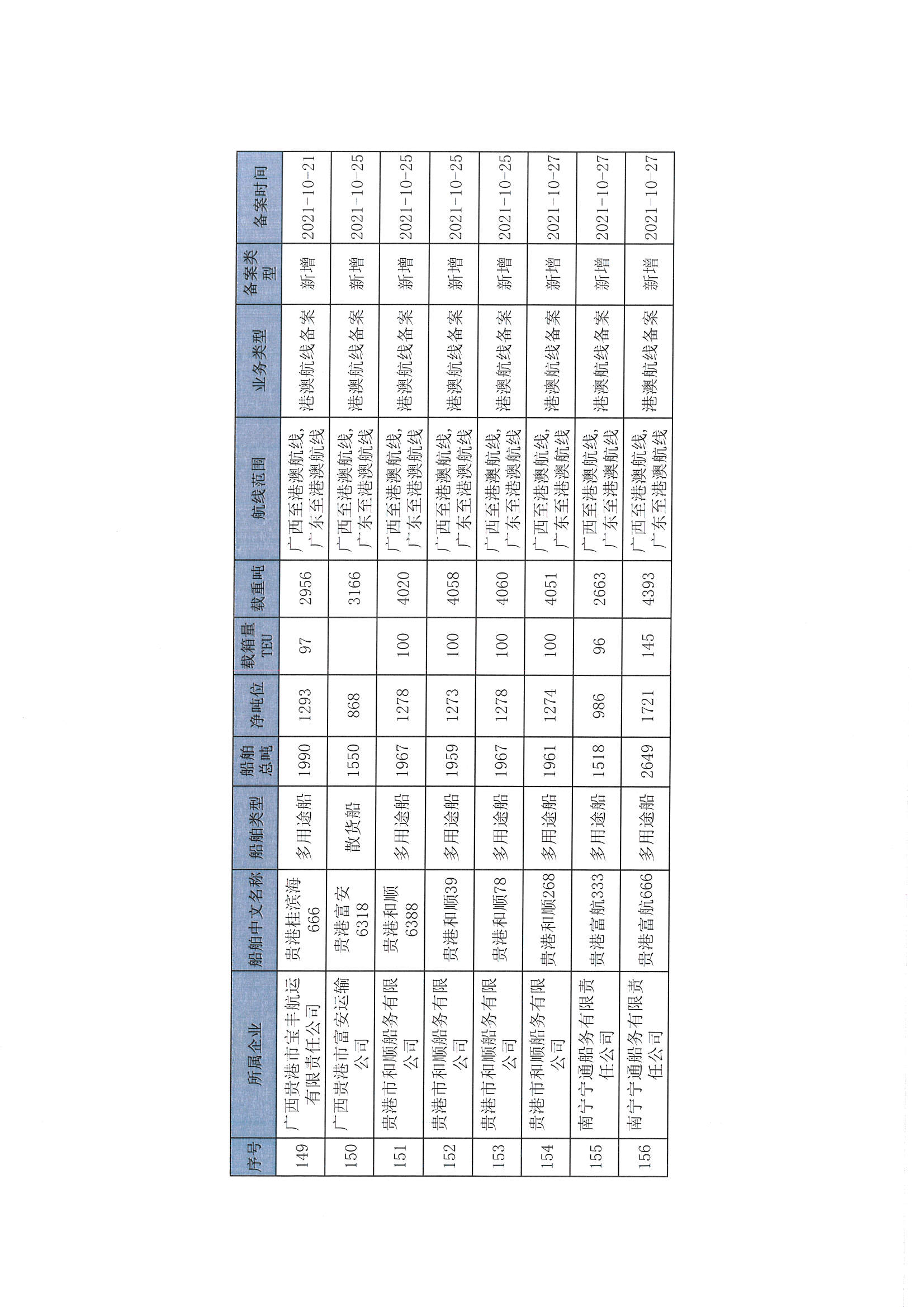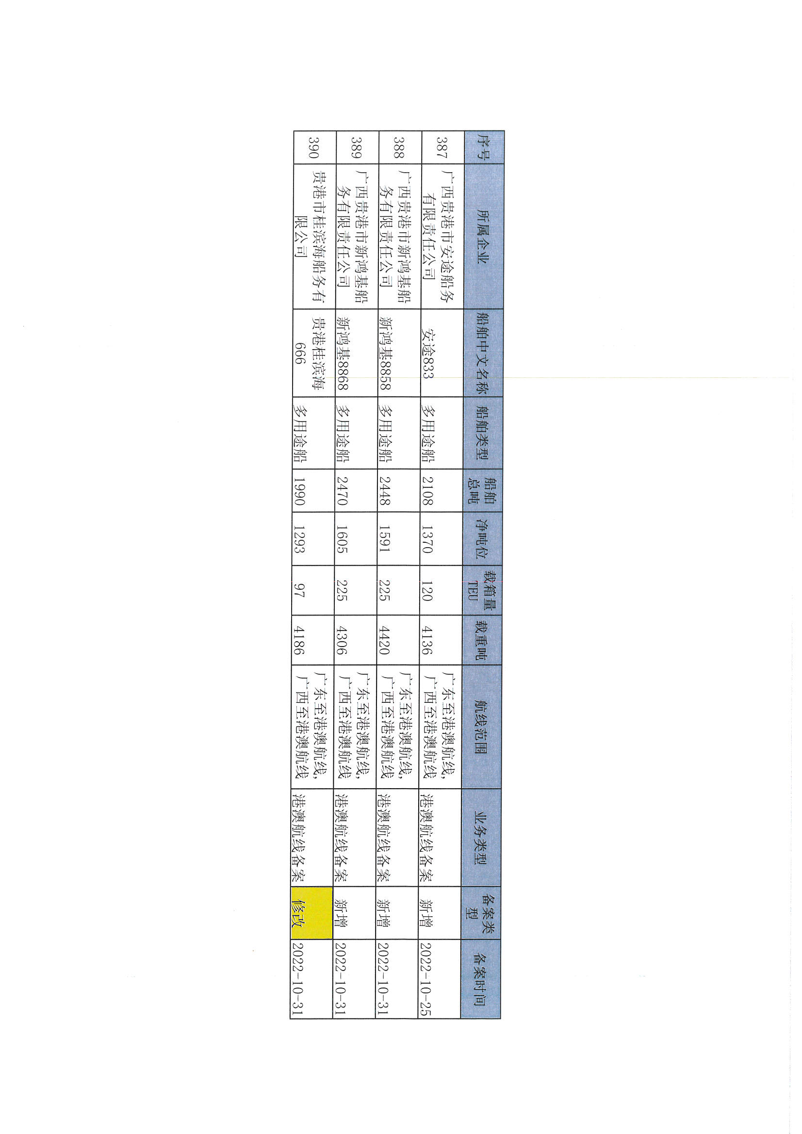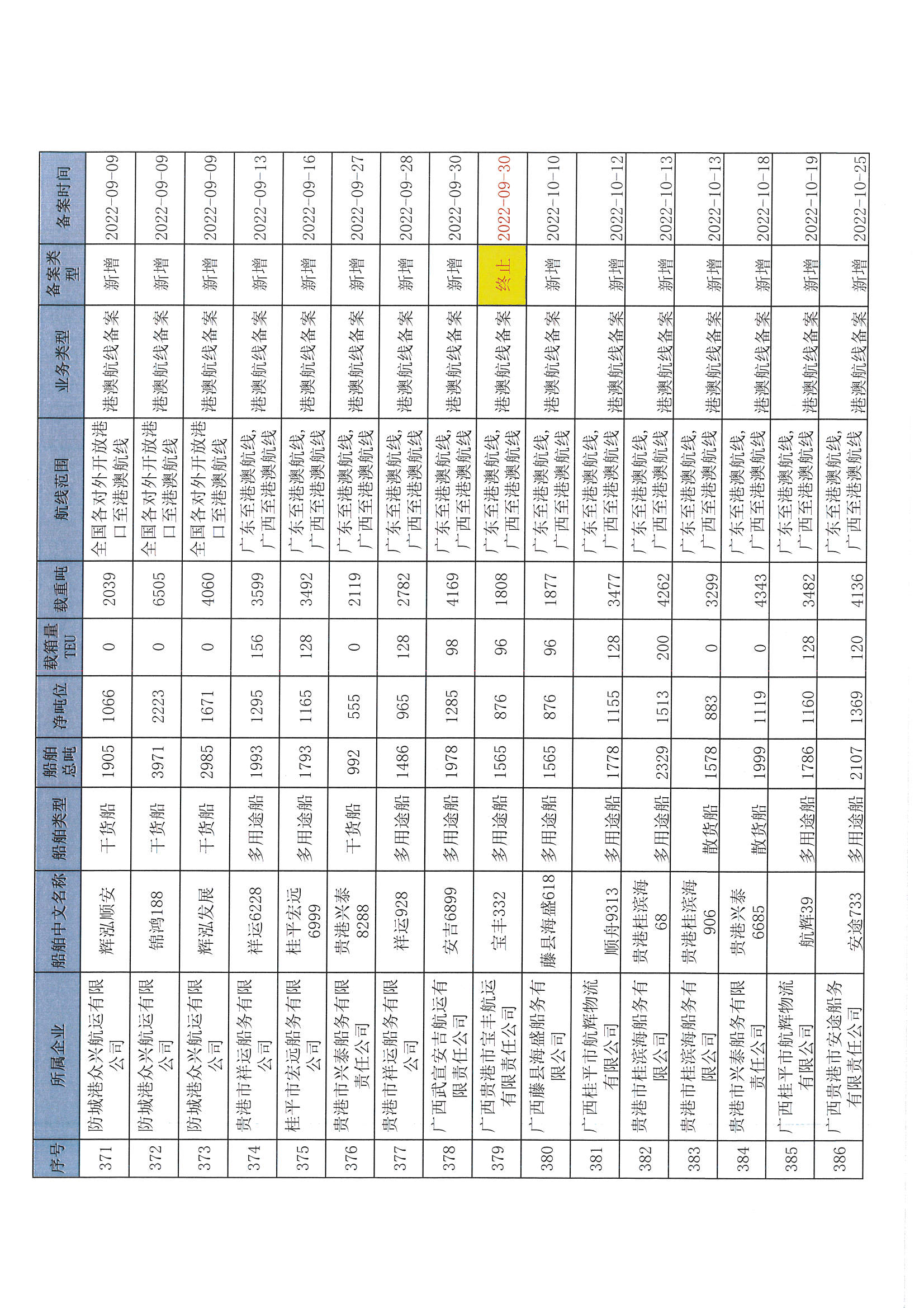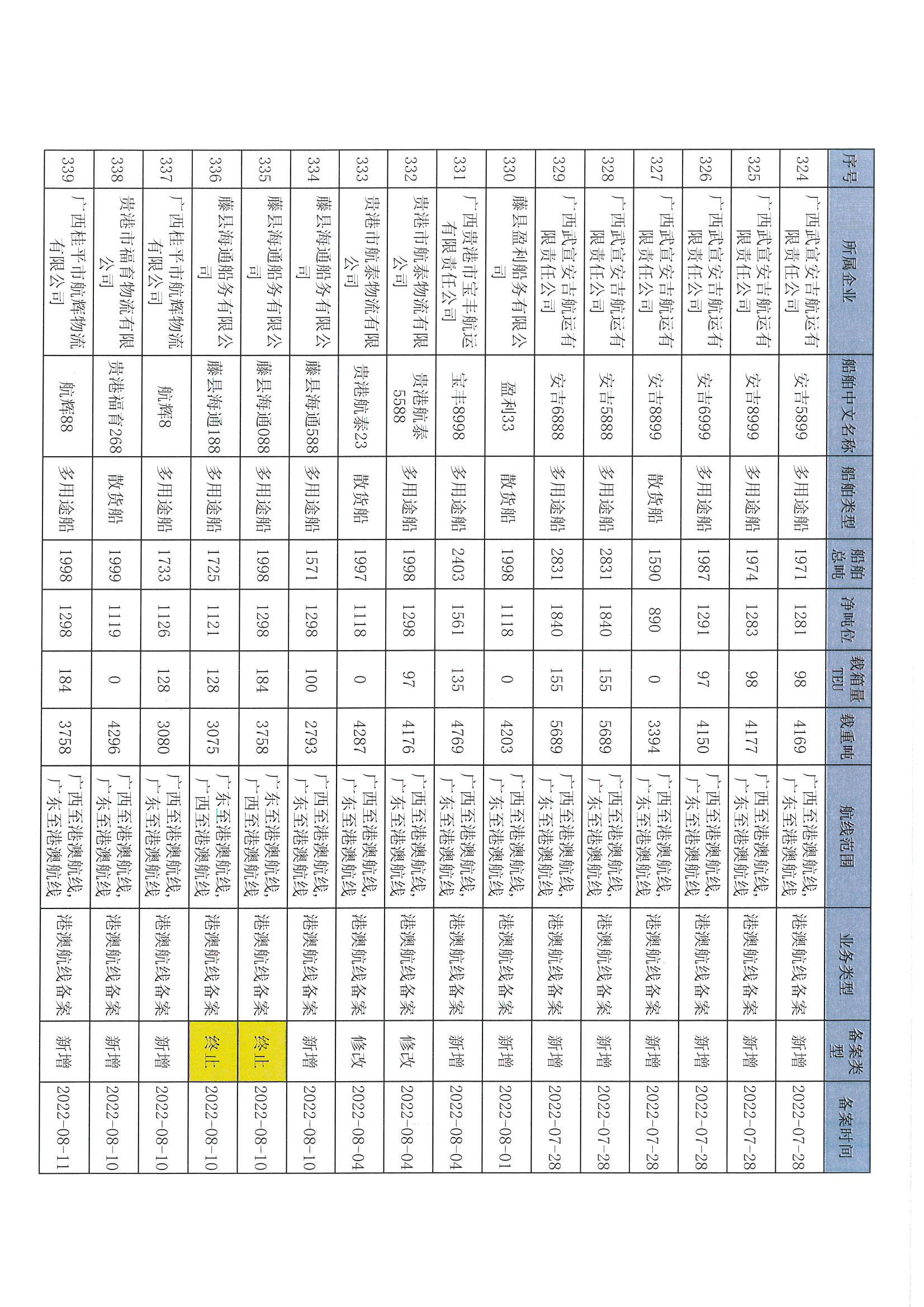 截至2022年12月11日在交通运输部水路运输建设综合管理信息系统完成备案的港澳航线水路运输船舶
