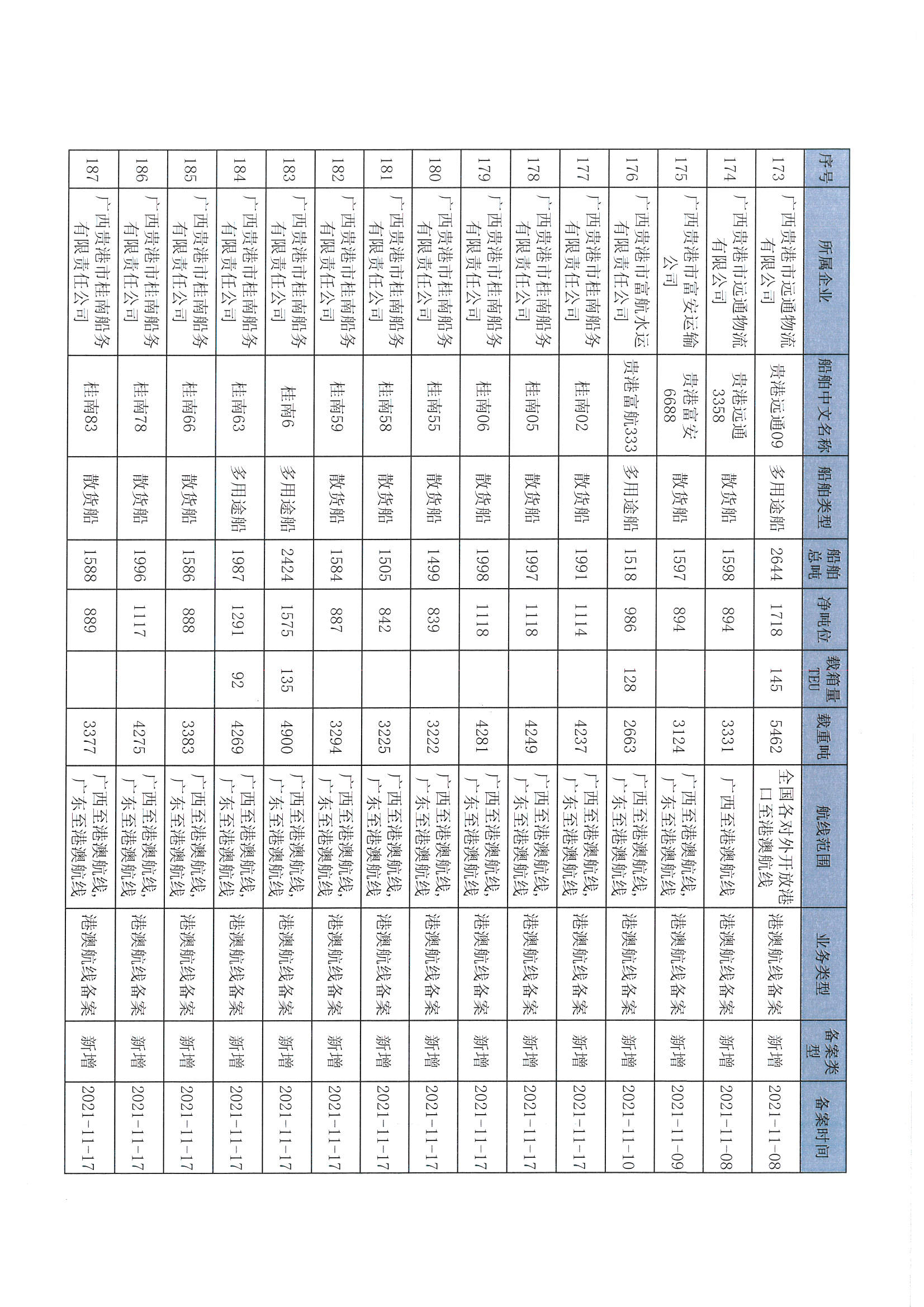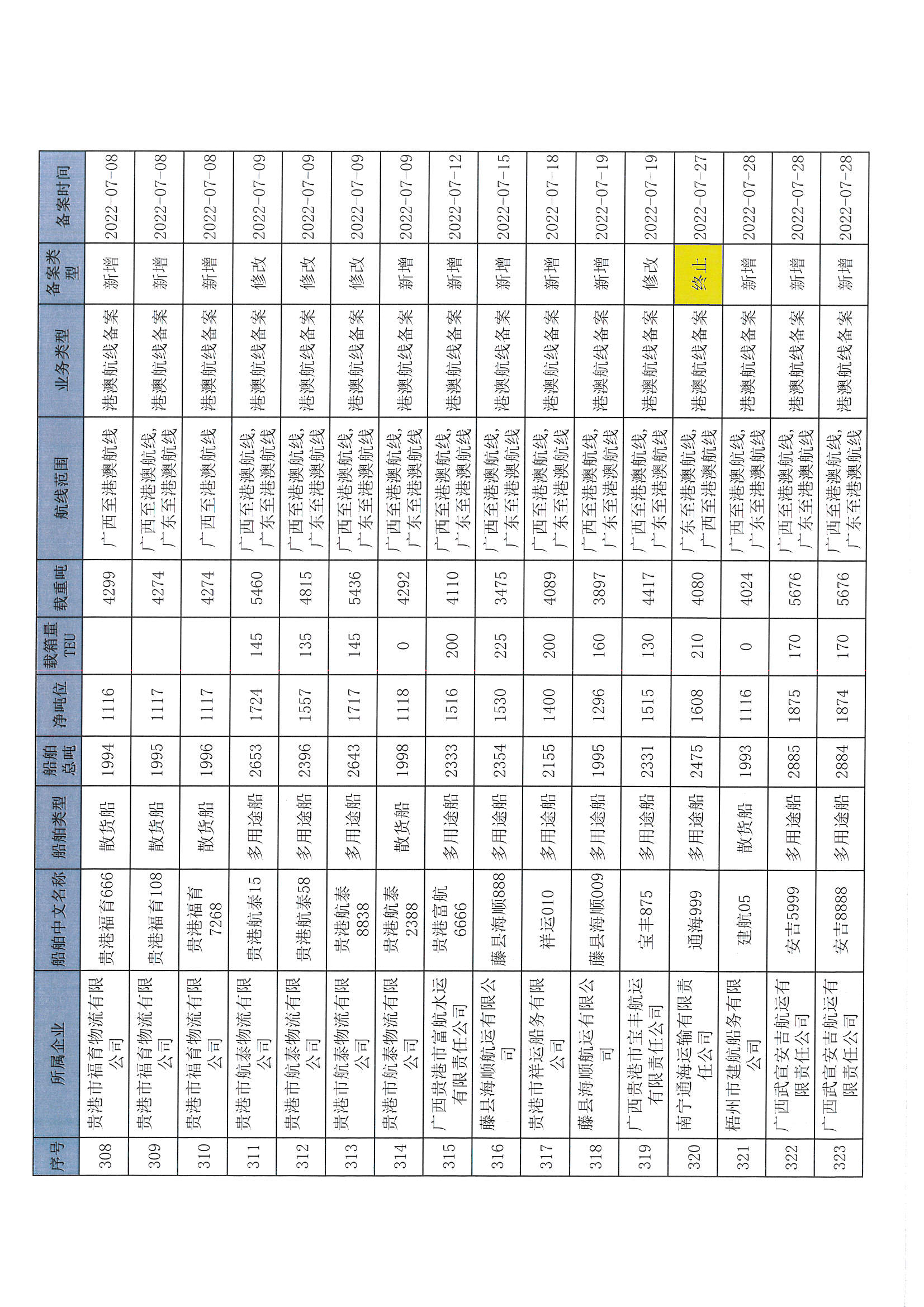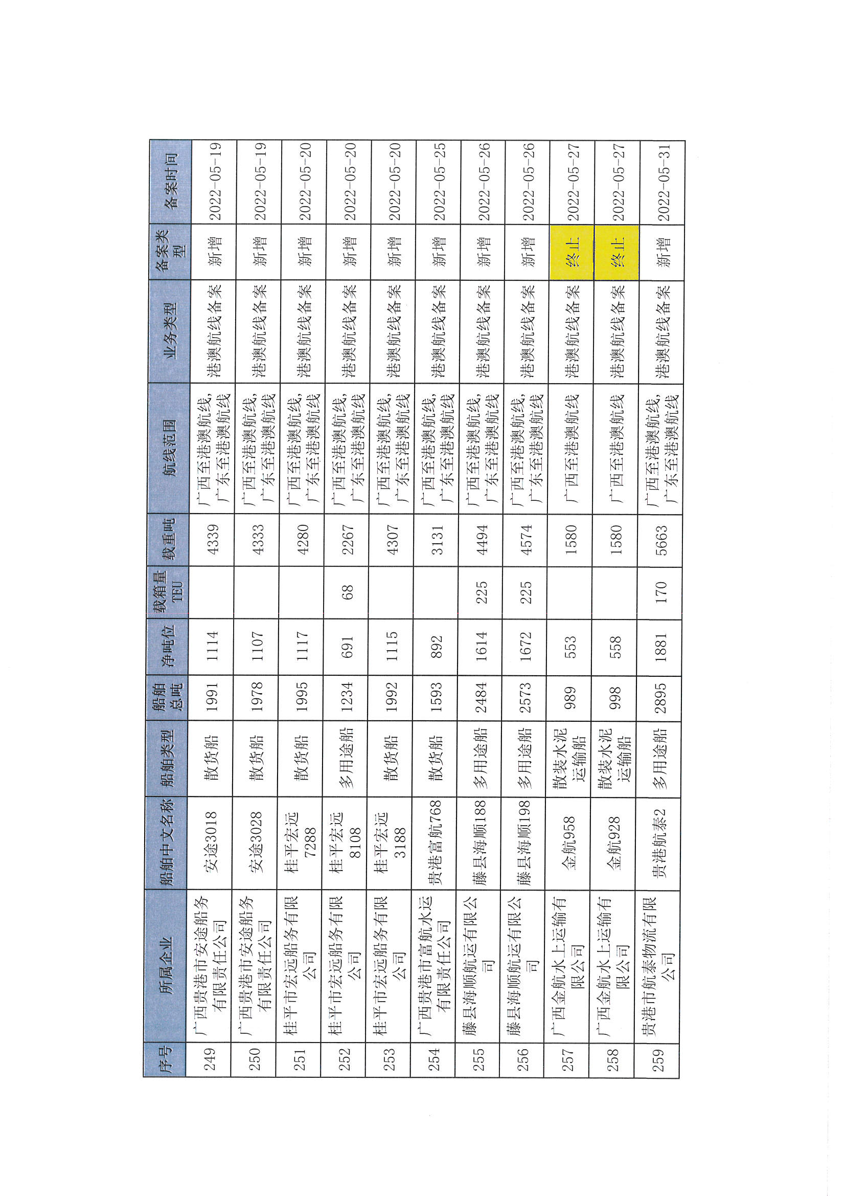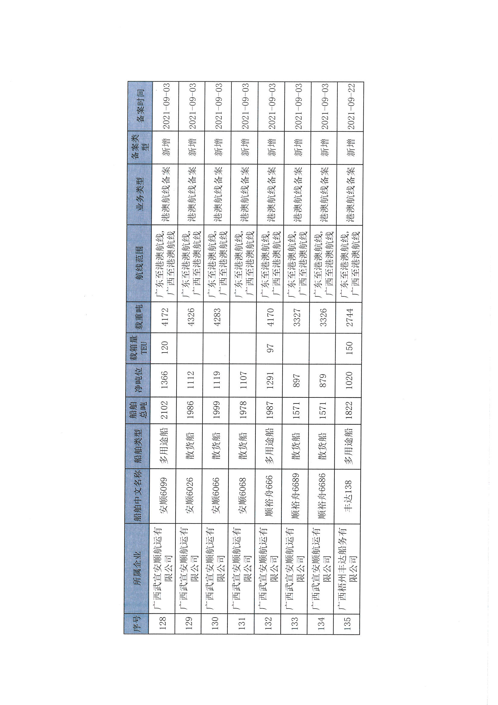 截至2022年12月11日在交通运输部水路运输建设综合管理信息系统完成备案的港澳航线水路运输船舶
