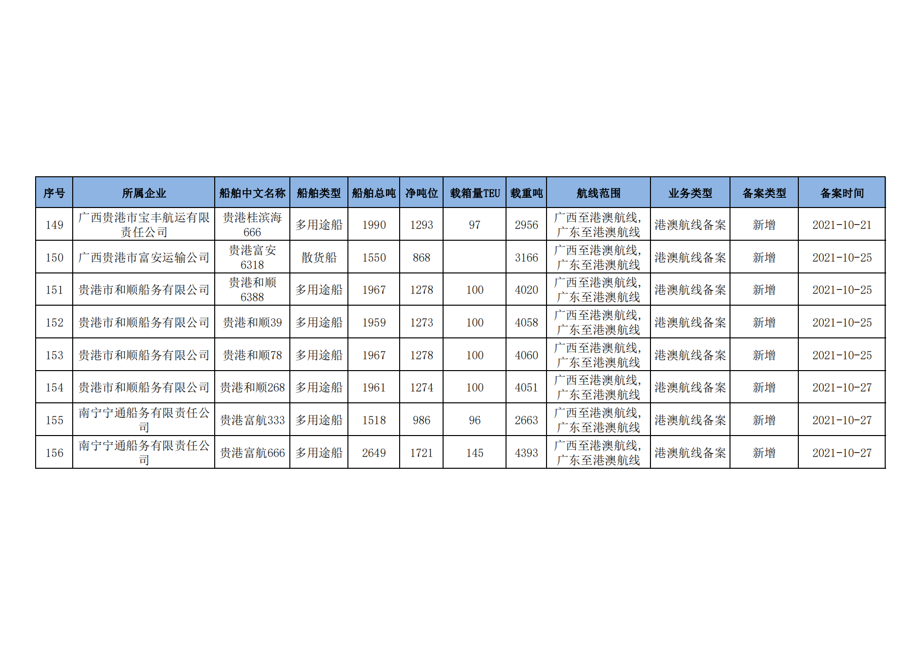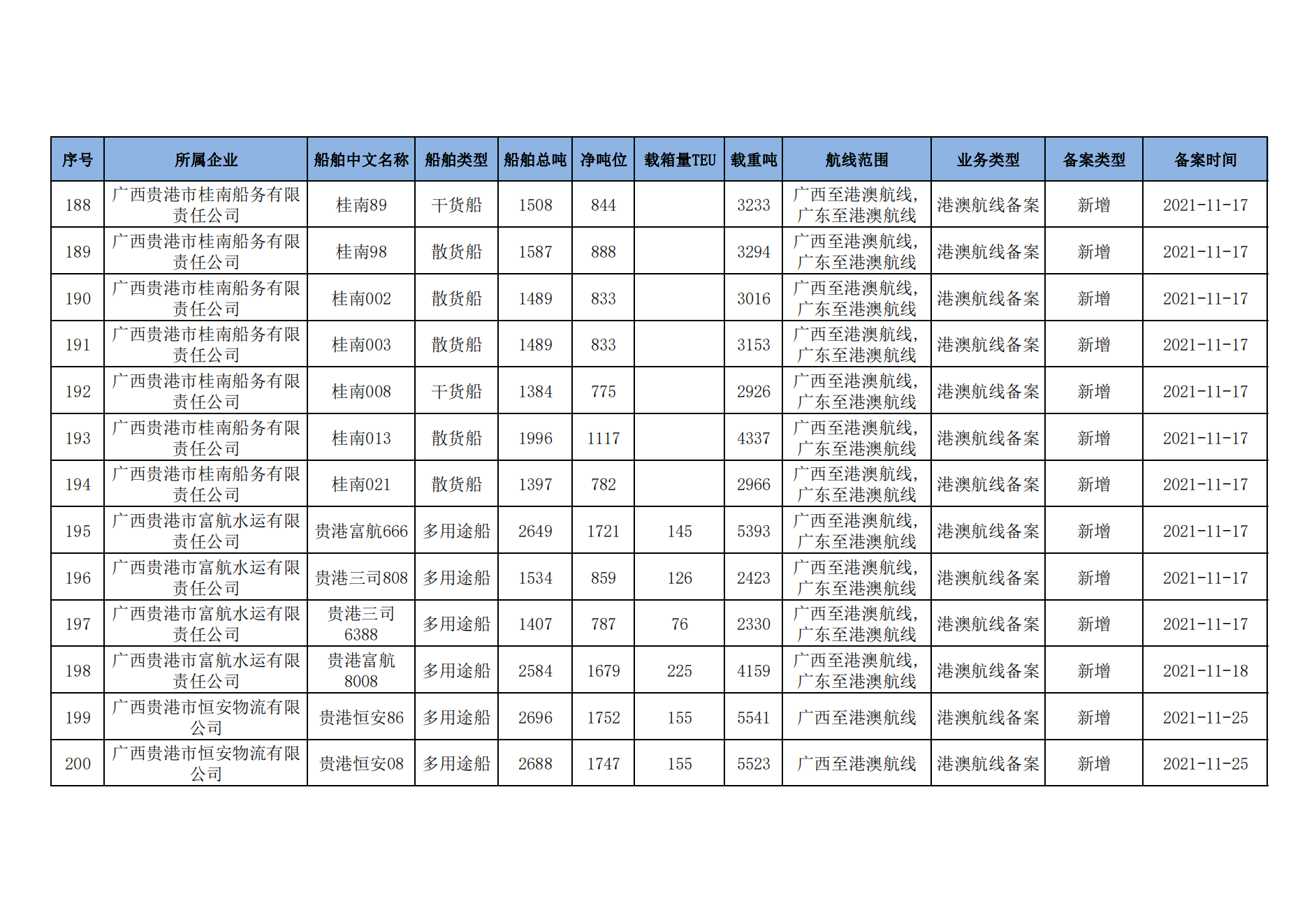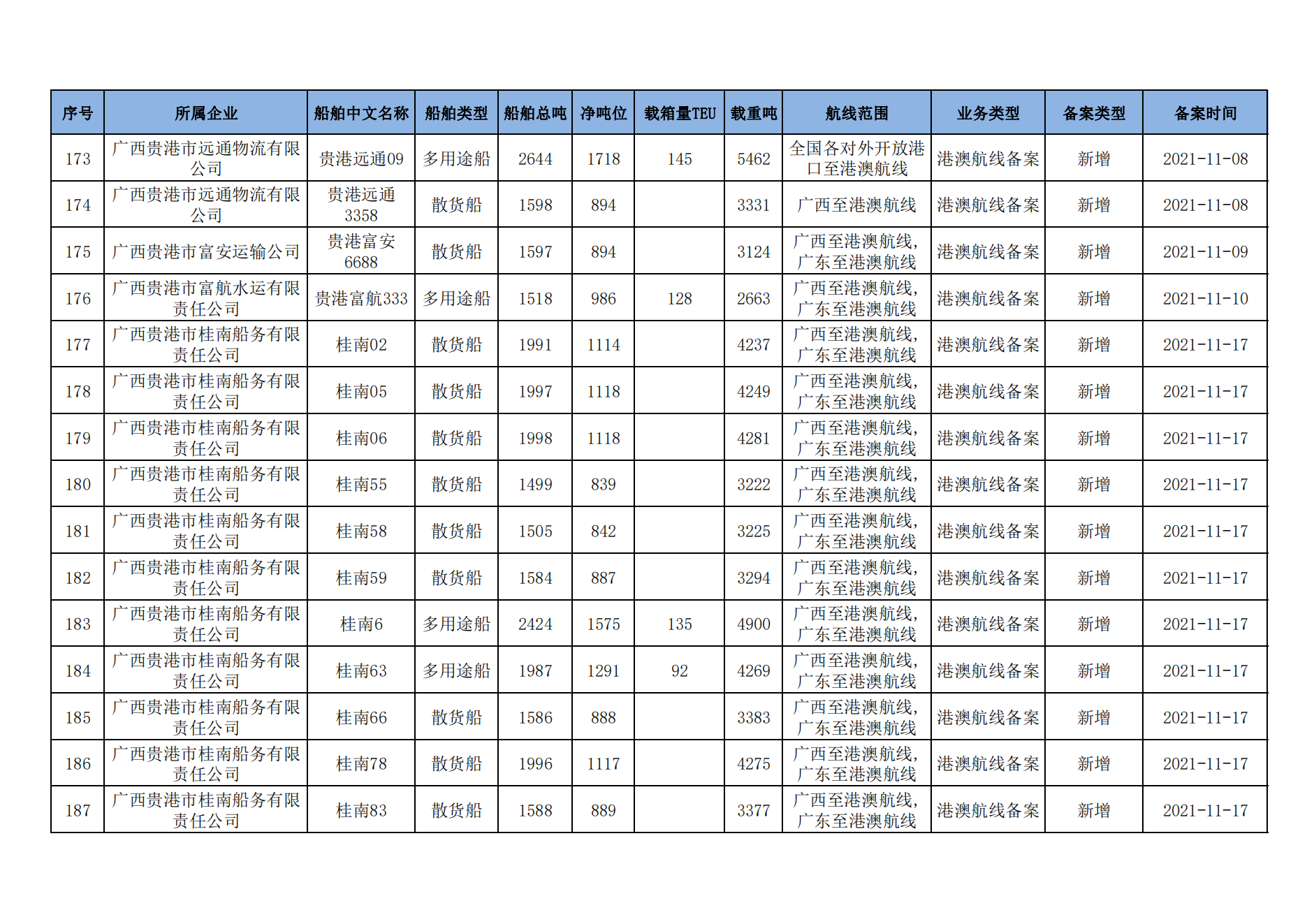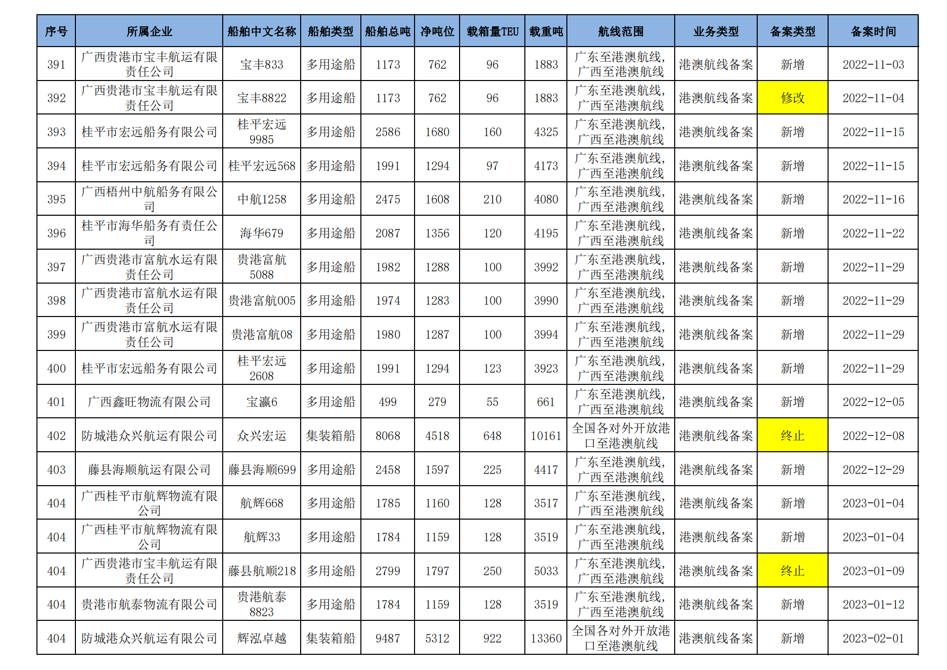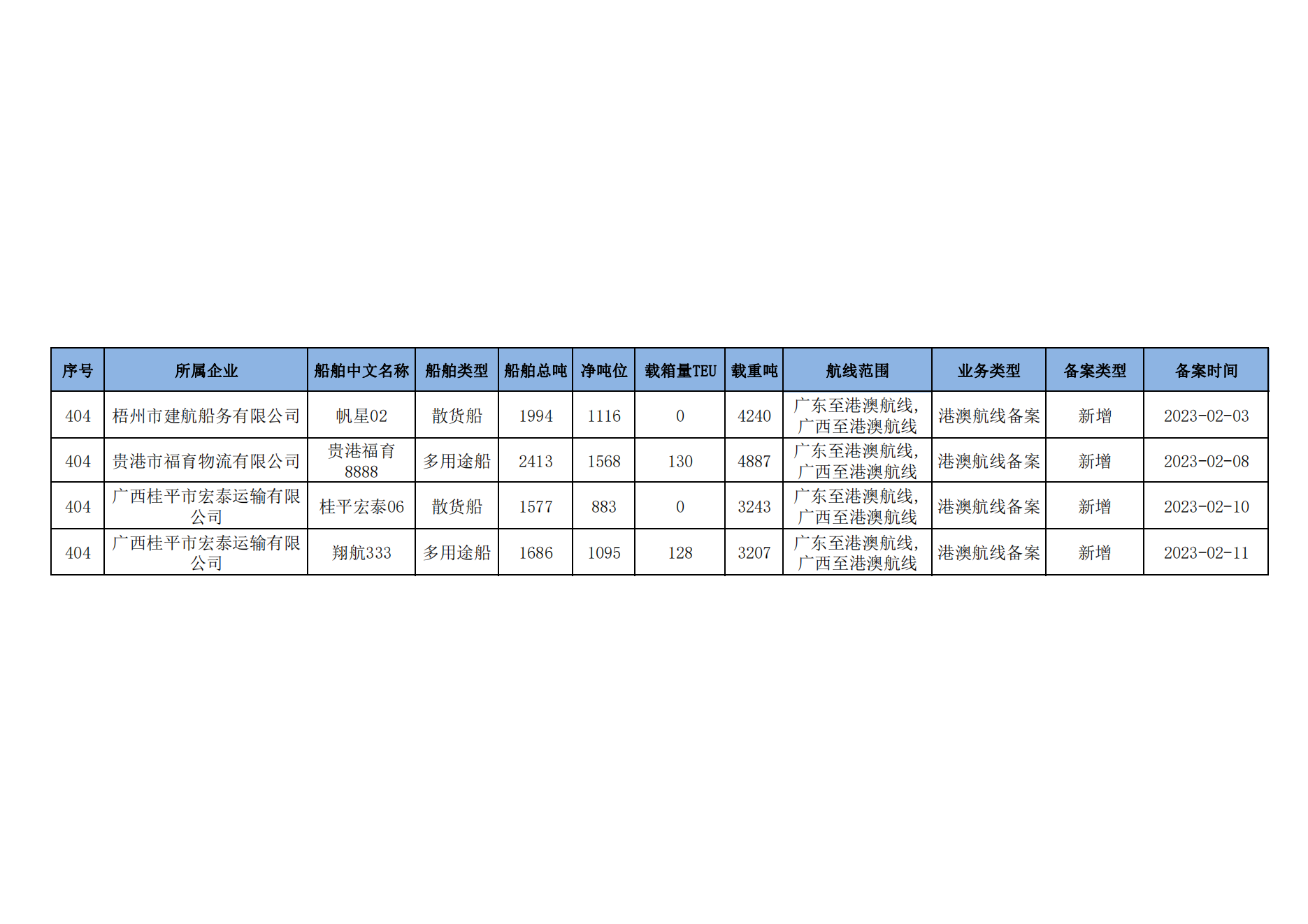 截至2023年2月11日在交通运输部水路运输建设综合管理信息系统完成备案的港澳航线水路运输船舶