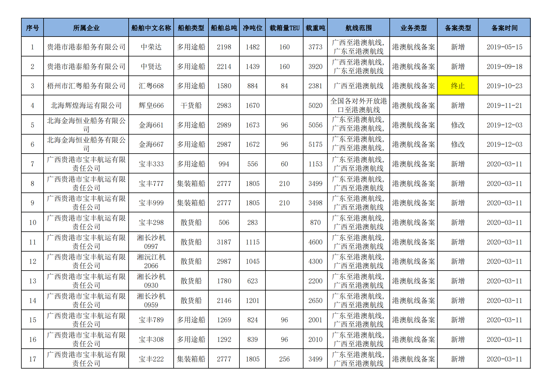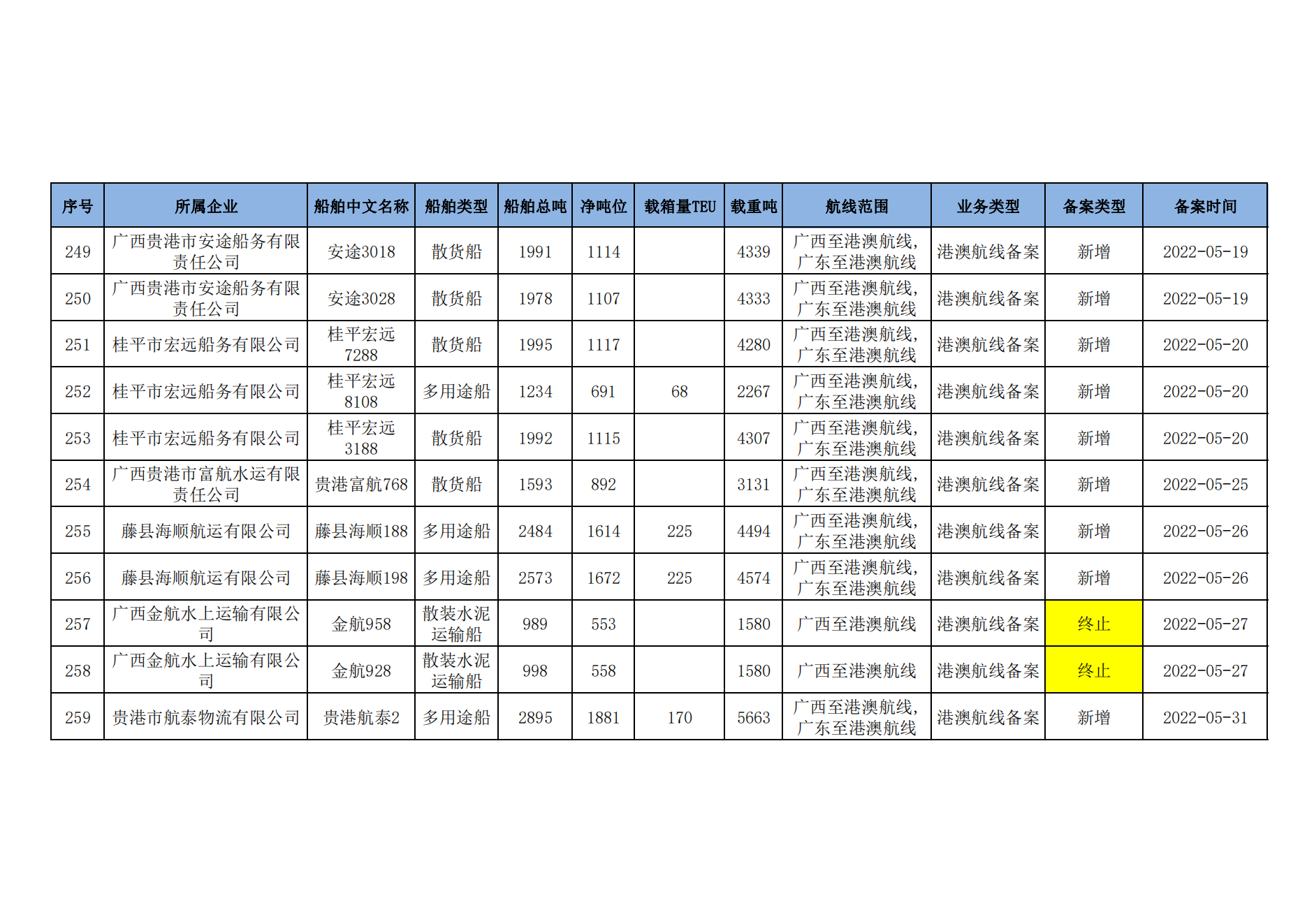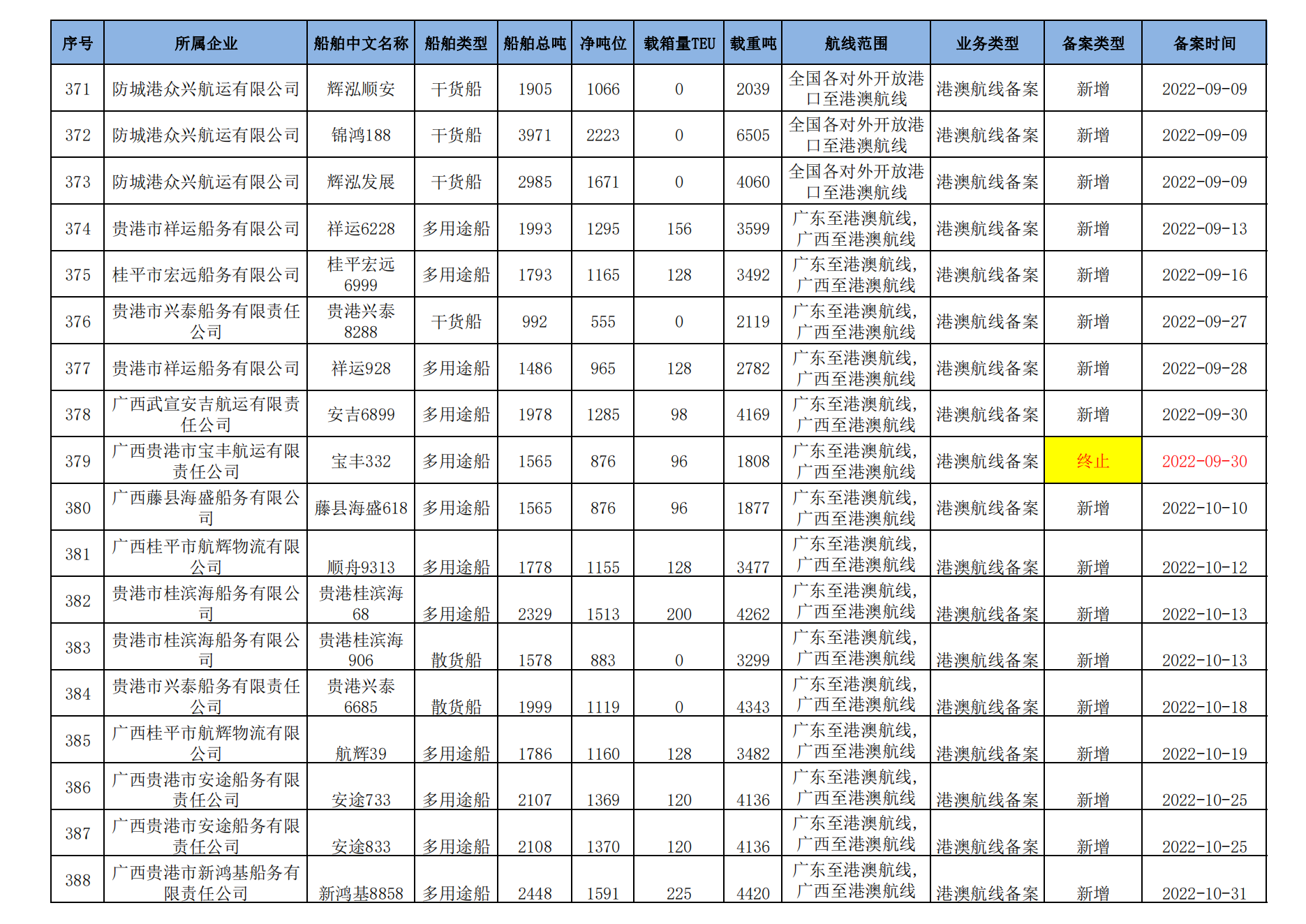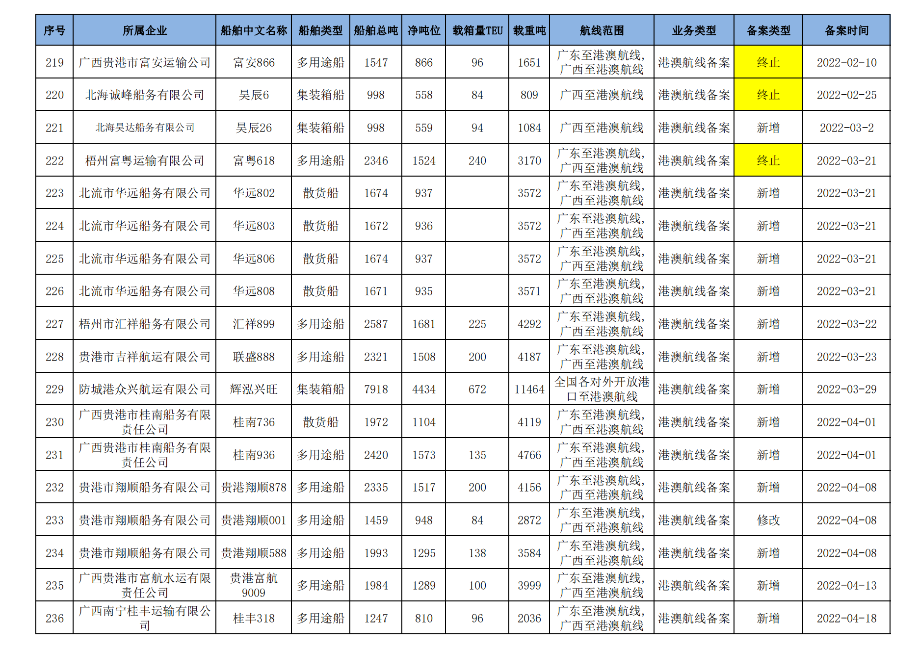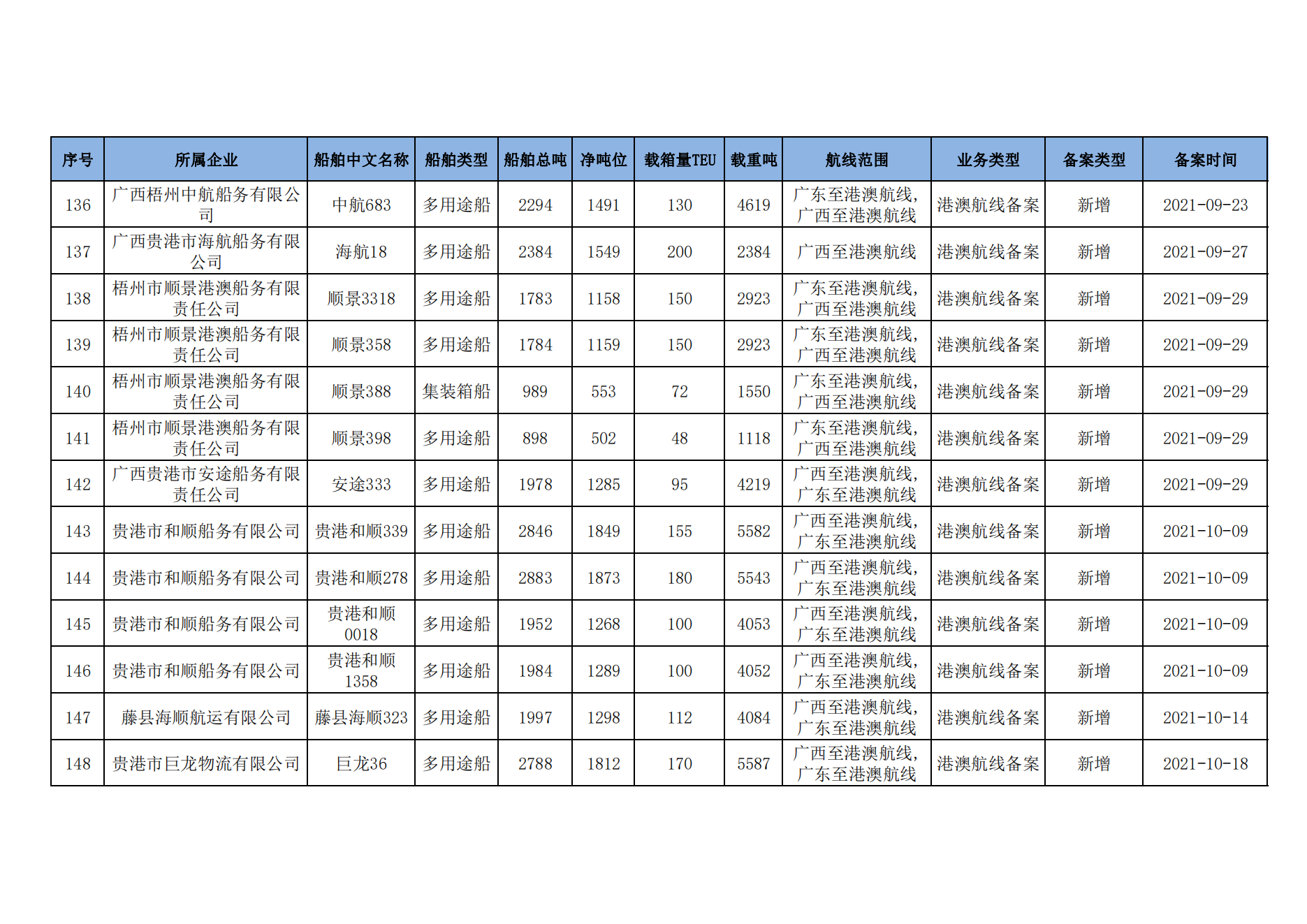 截至2023年2月11日在交通运输部水路运输建设综合管理信息系统完成备案的港澳航线水路运输船舶