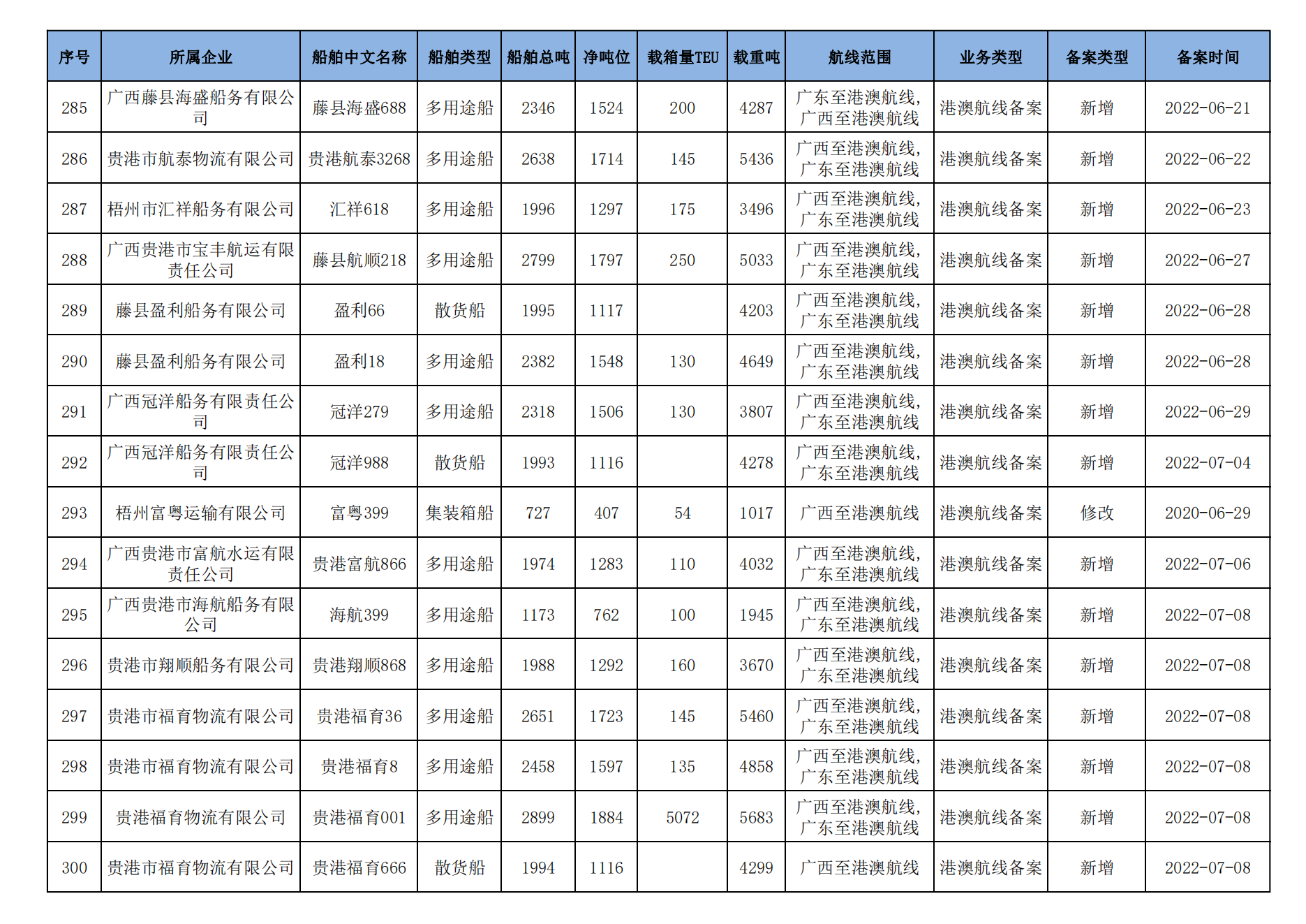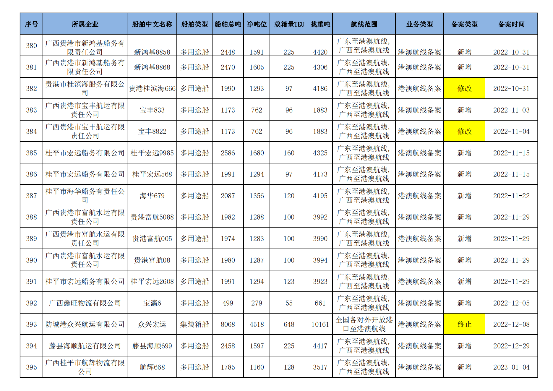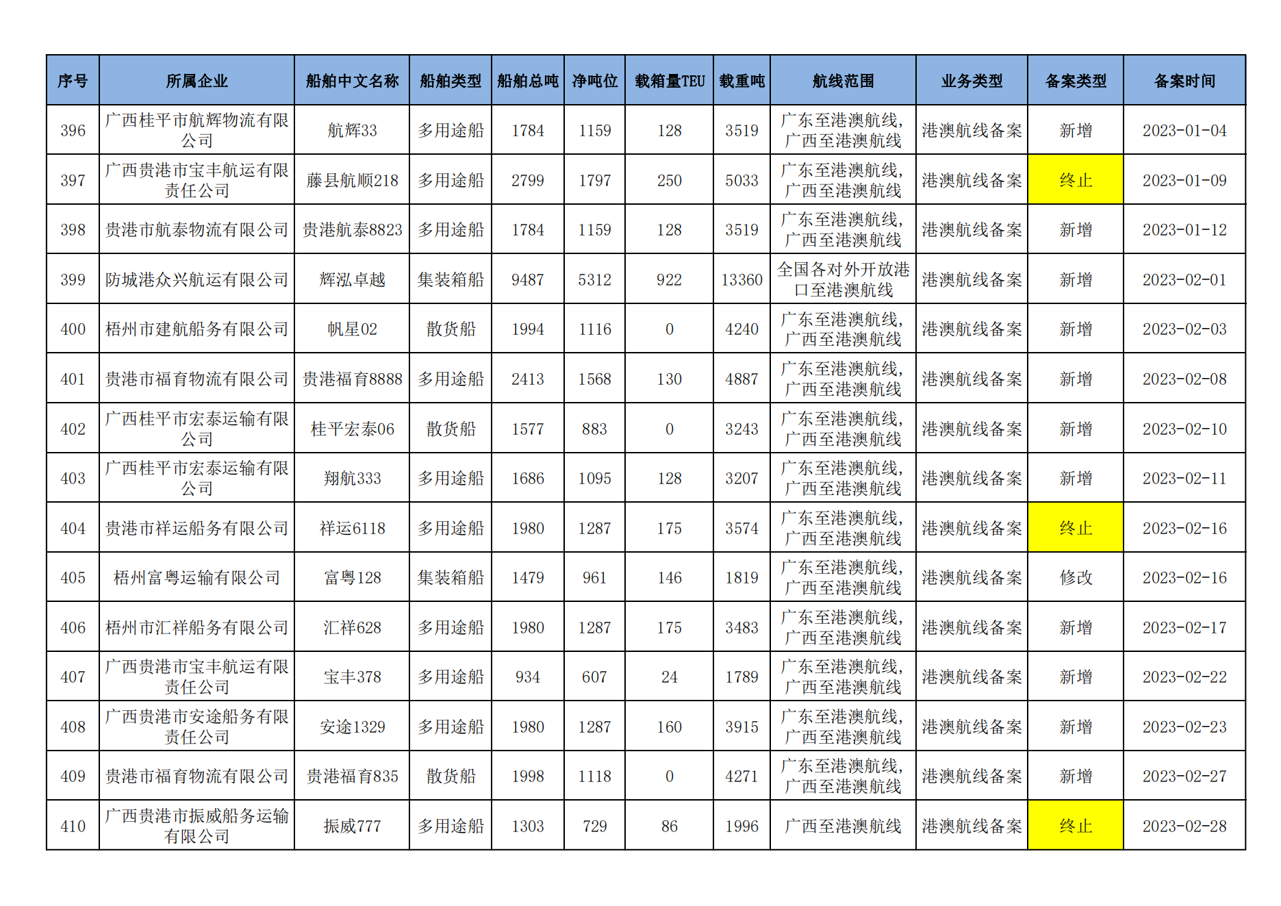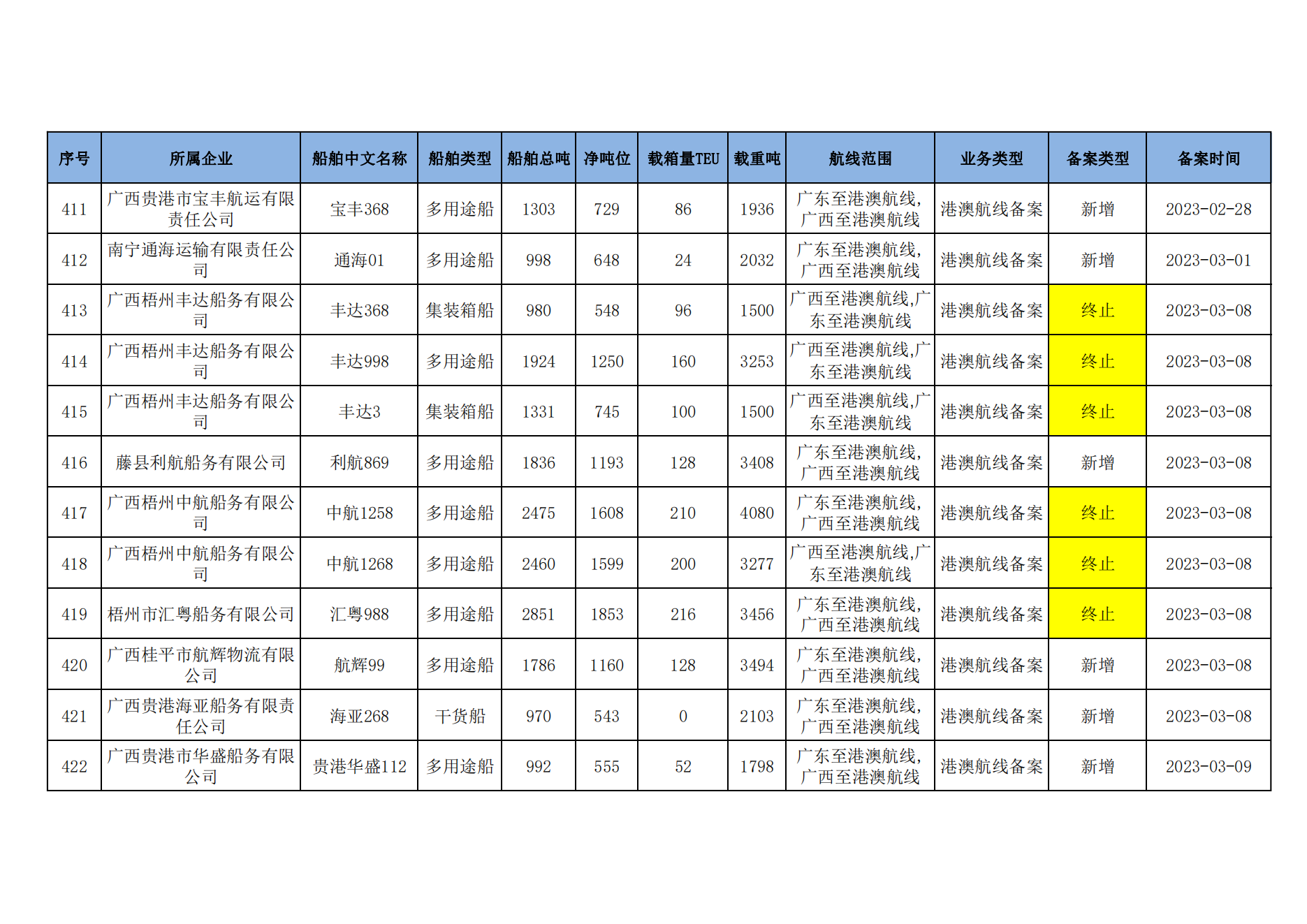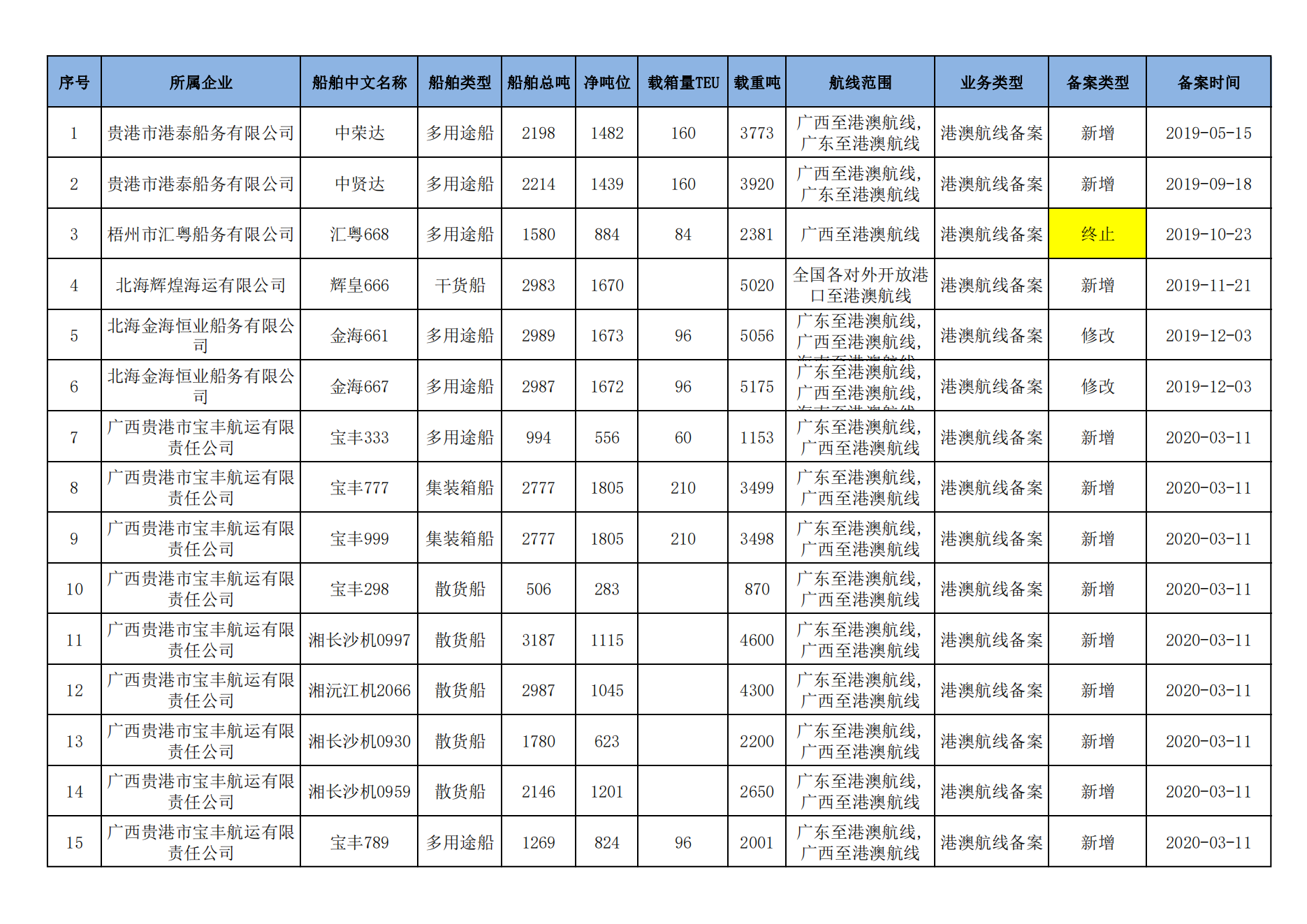截至2023年3月11日在交通运输部水路运输建设综合管理信息系统完成备案的港澳航线水路运输船舶