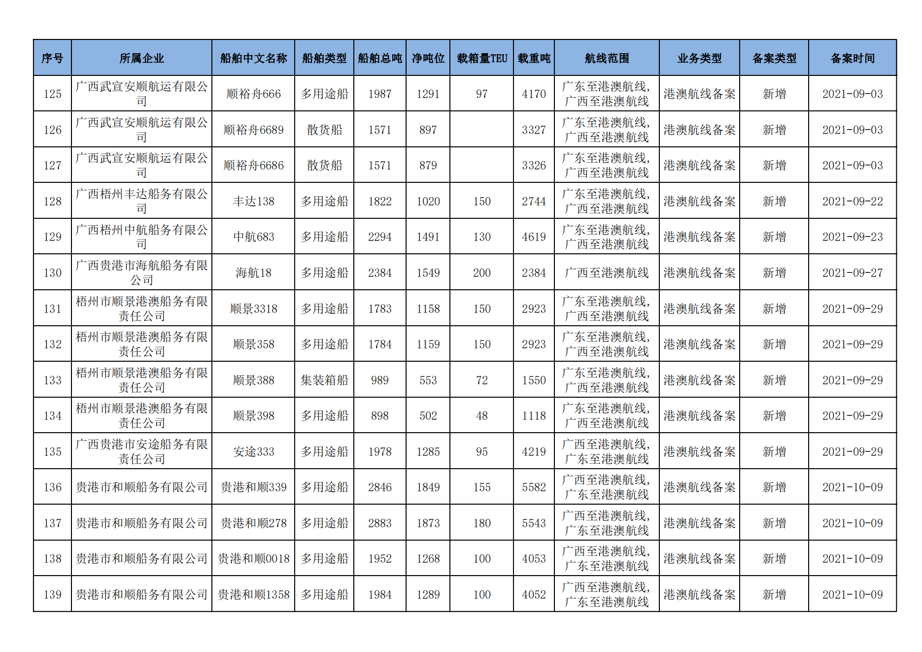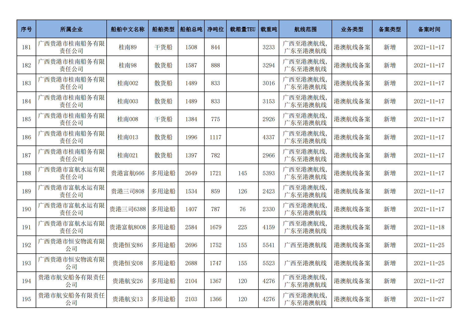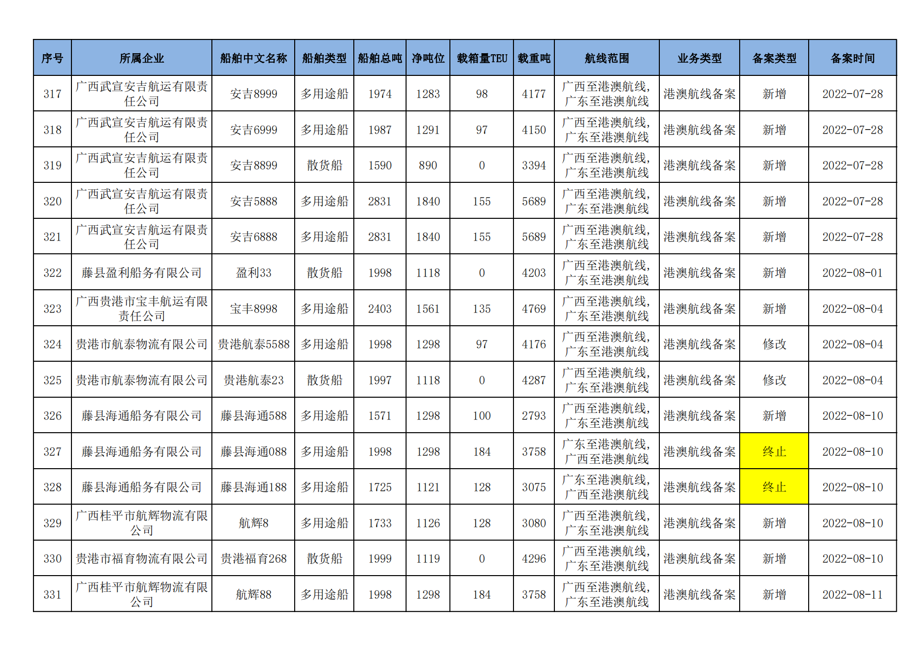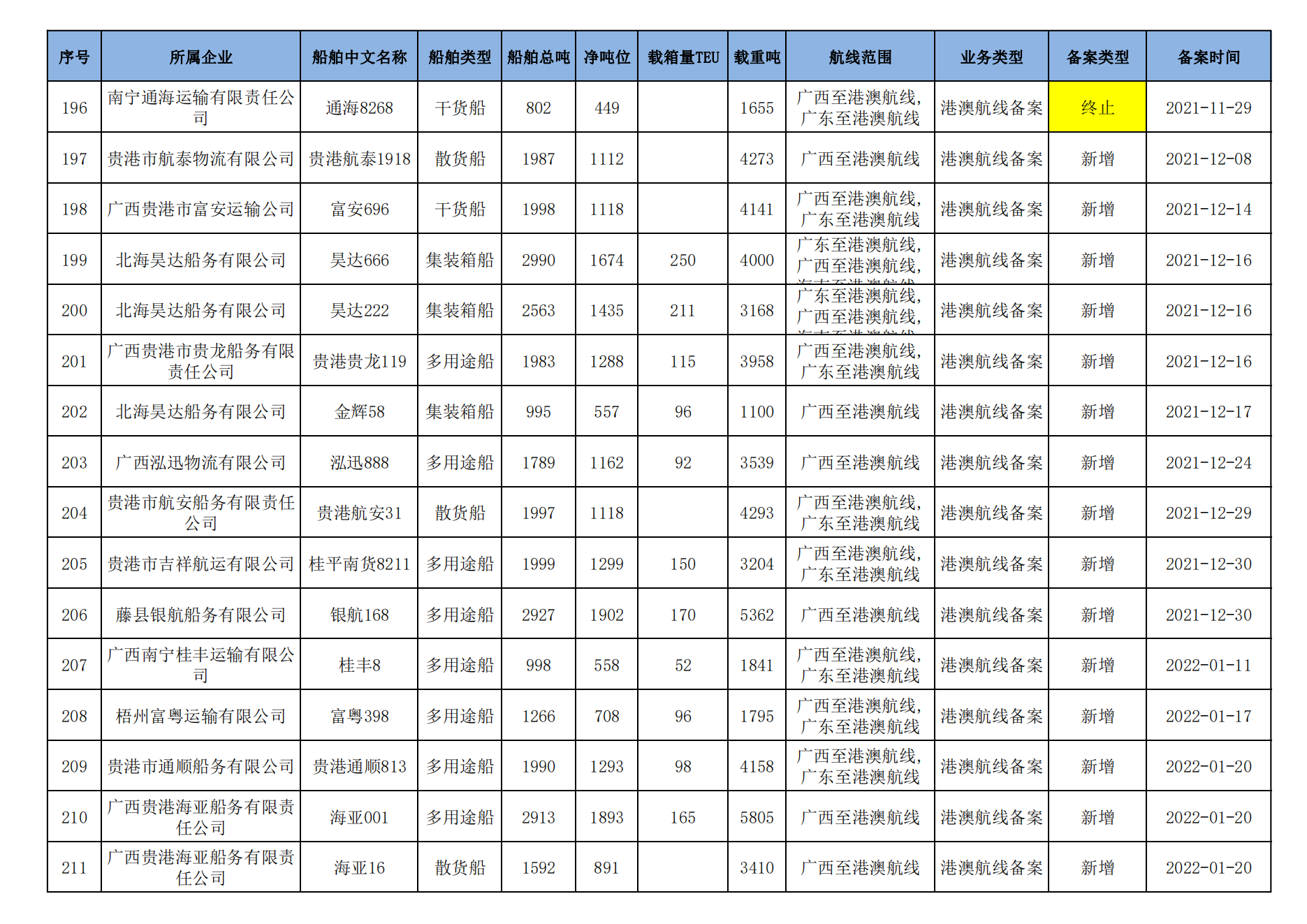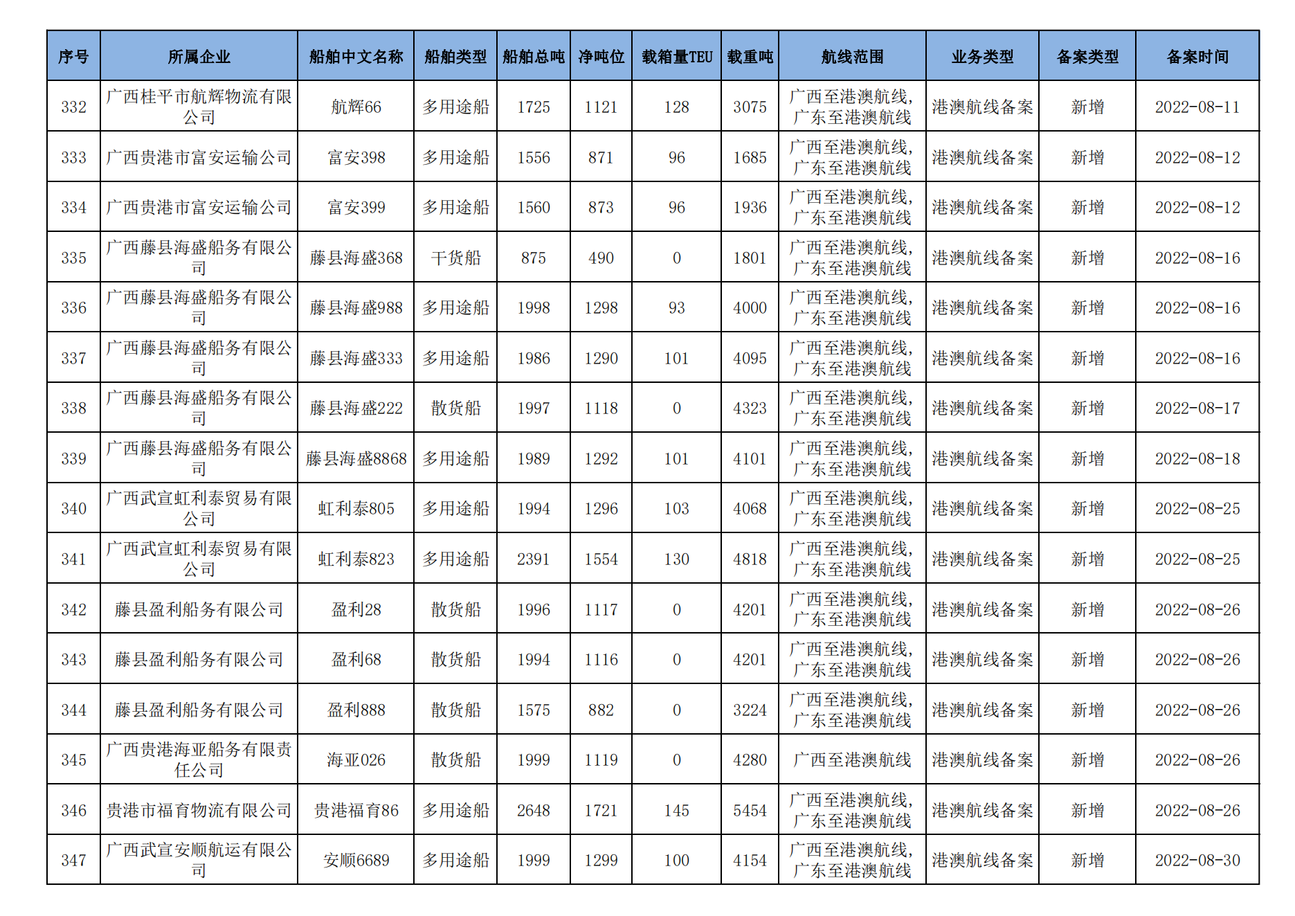 截至2023年3月11日在交通运输部水路运输建设综合管理信息系统完成备案的港澳航线水路运输船舶