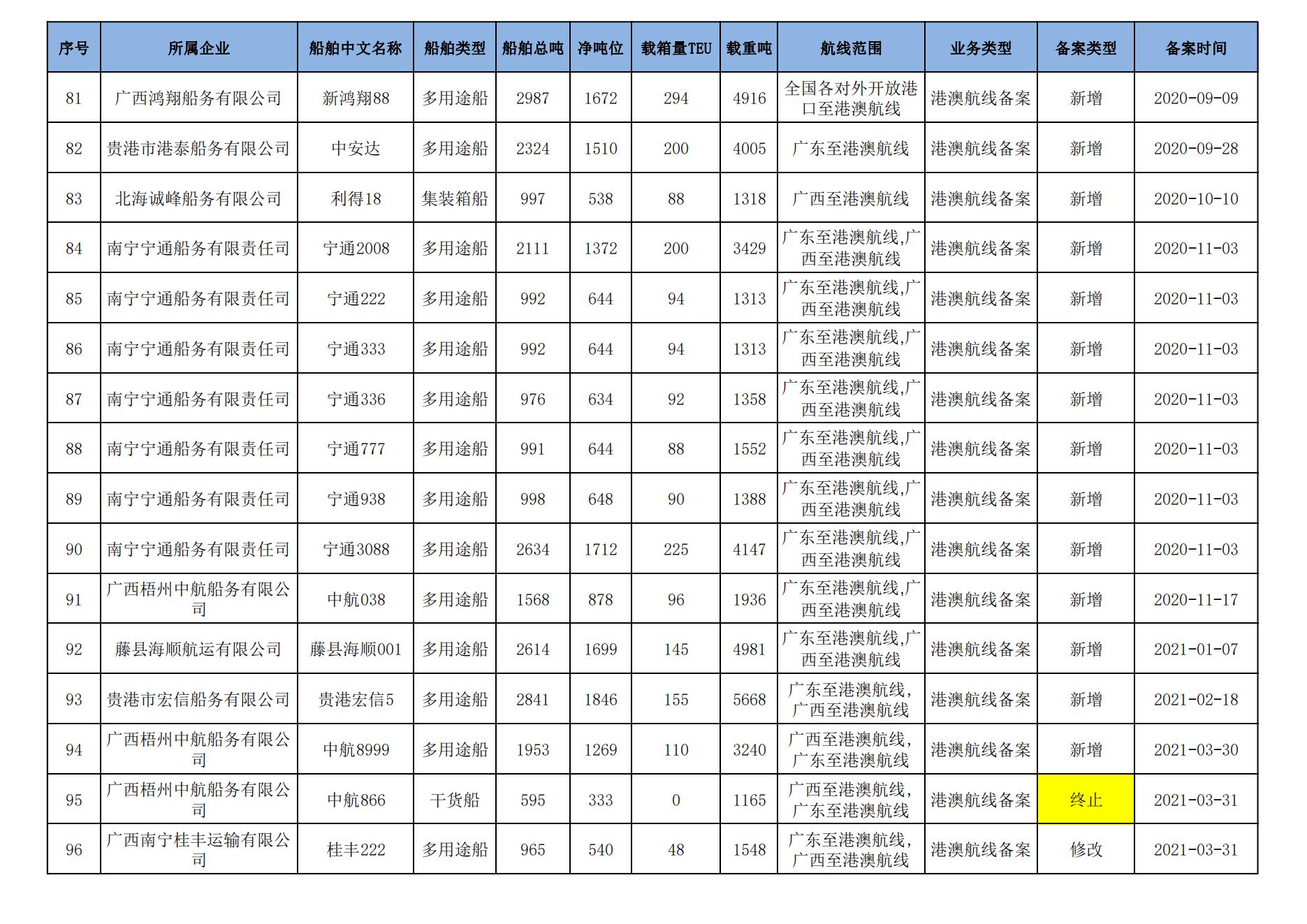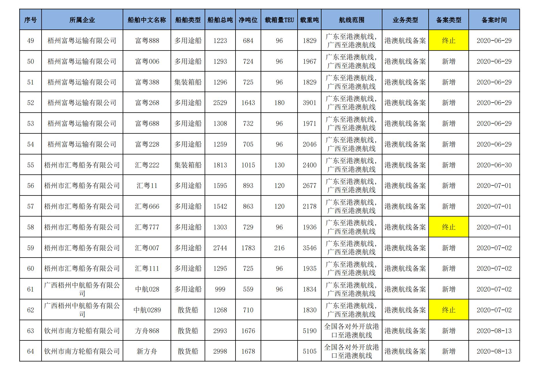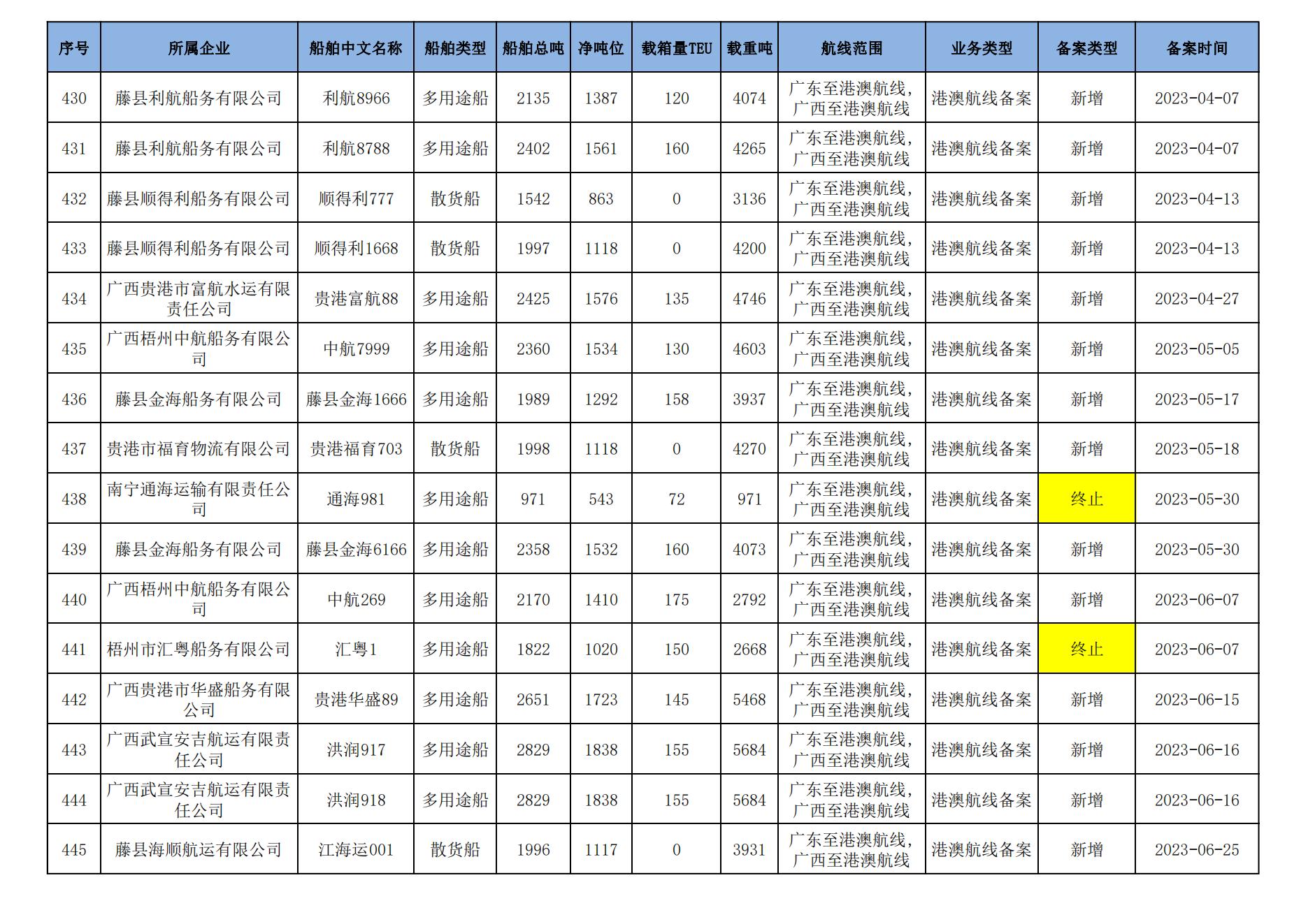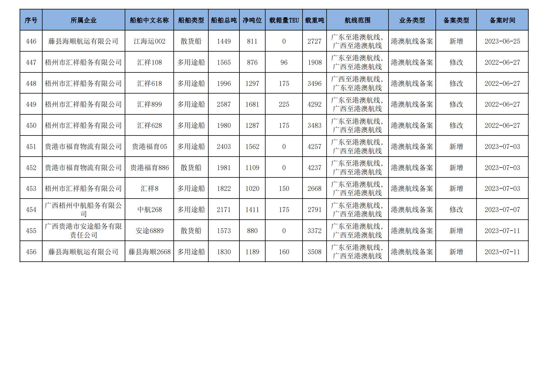 截至2023年7月11日在交通运输部水路运输建设综合管理信息系统完成备案的港澳航线水路运输船舶