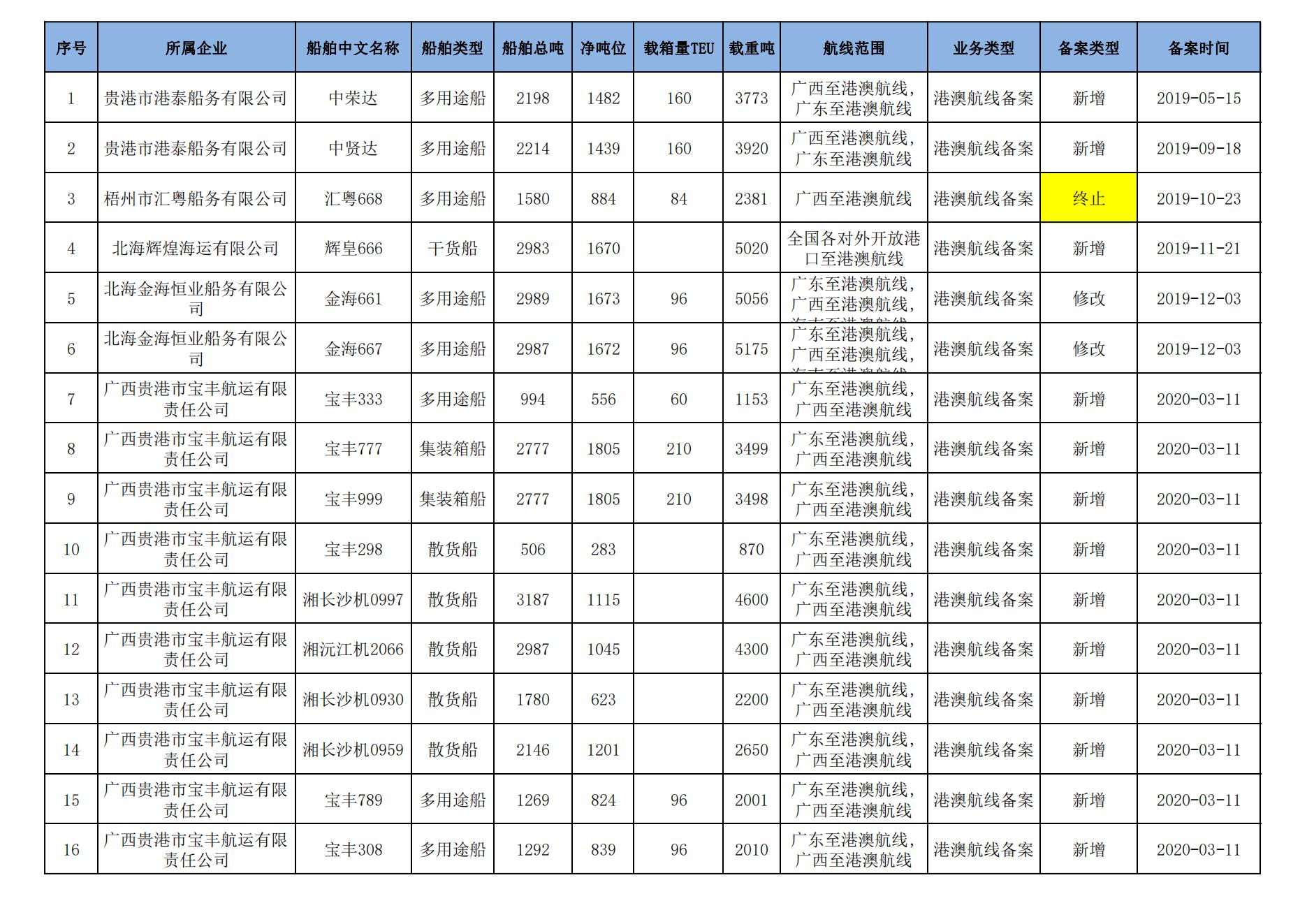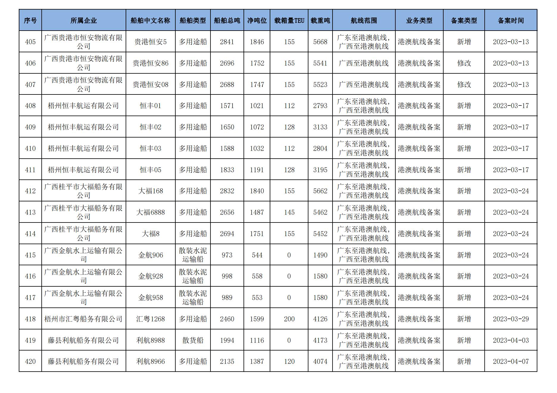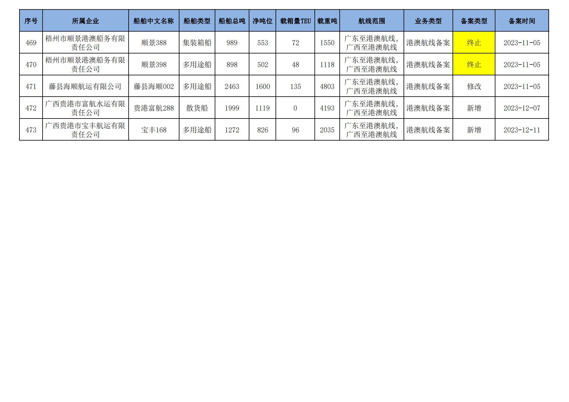 截至2023年12月11日在交通运输部水路运输建设综合管理信息系统完成备案的港澳航线水路运输船舶