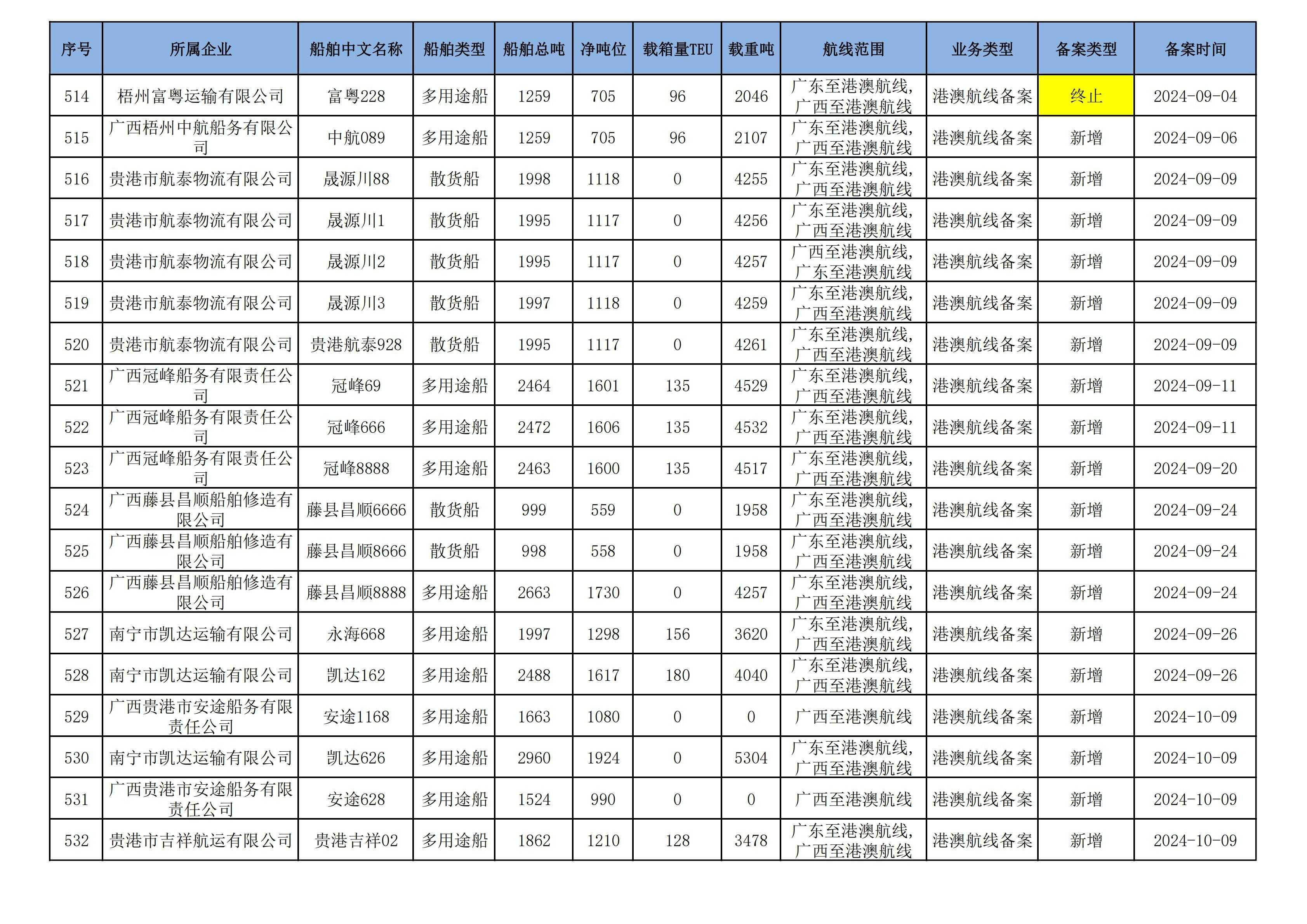 截至2024年12月12日在交通运输部水路运输建设综合管理信息系统完成备案的港澳航线水路运输船舶