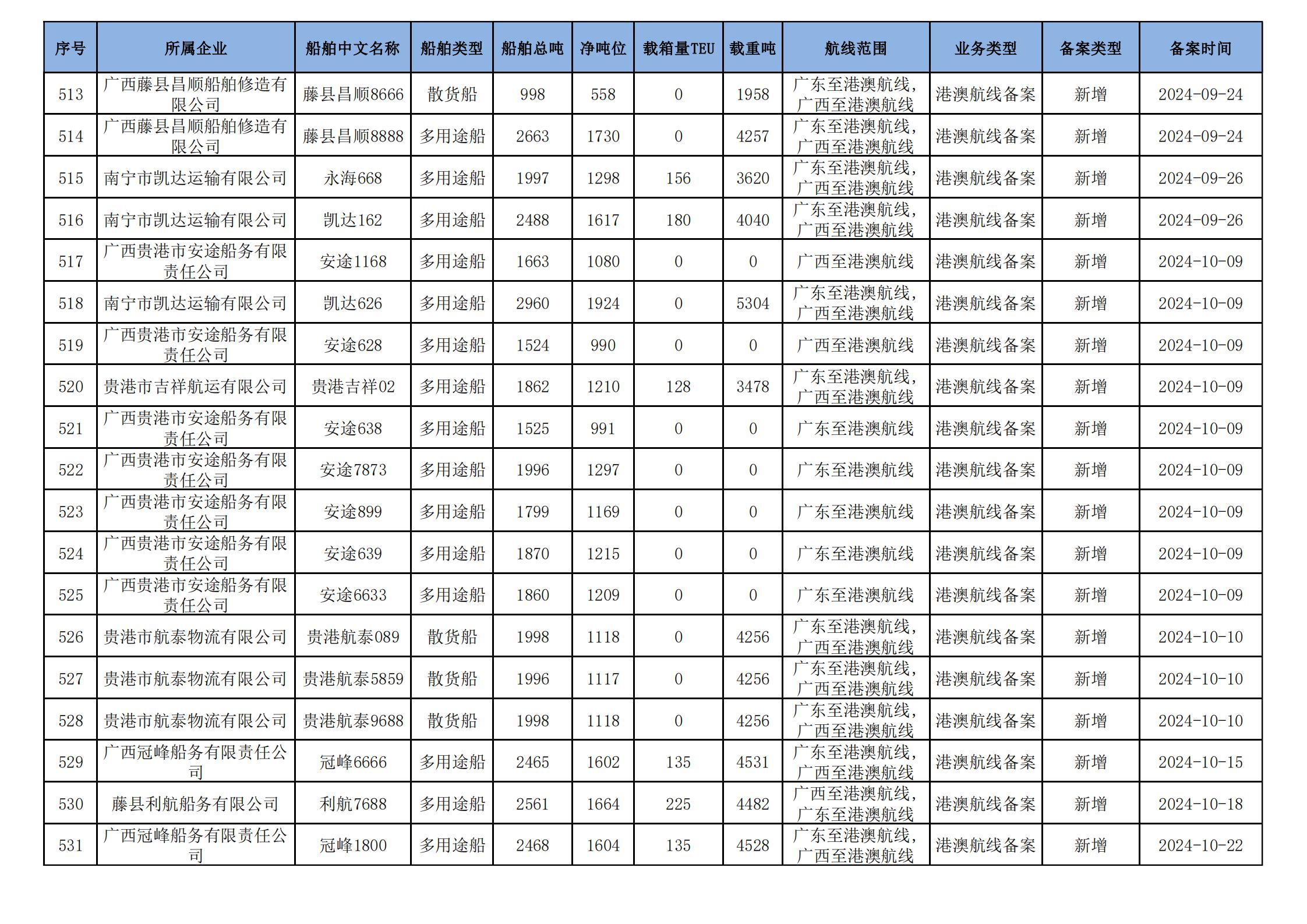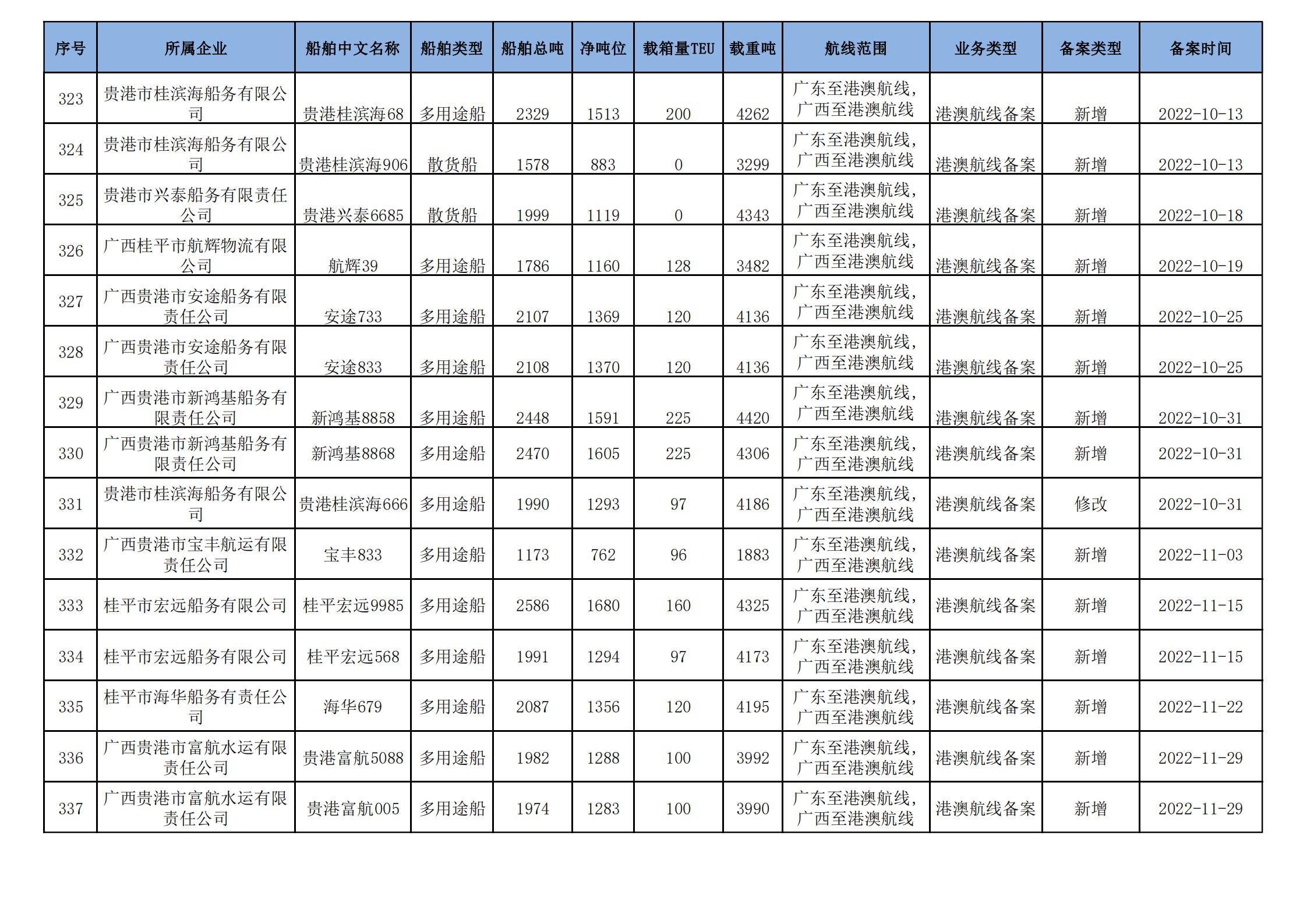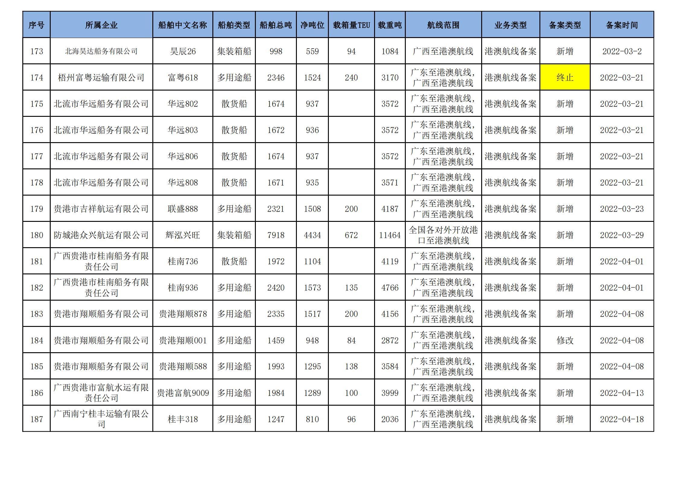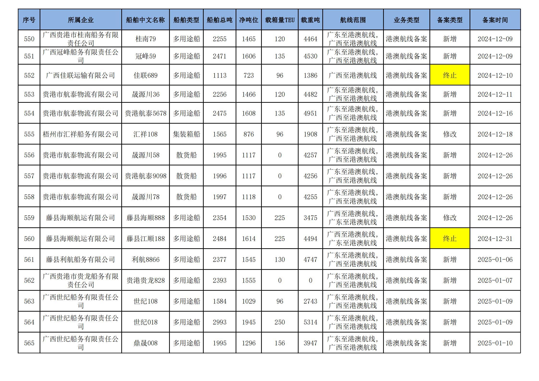 截至2025年4月15日在交通运输部水路运输建设综合管理信息系统完成备案的港澳航线水路运输船舶