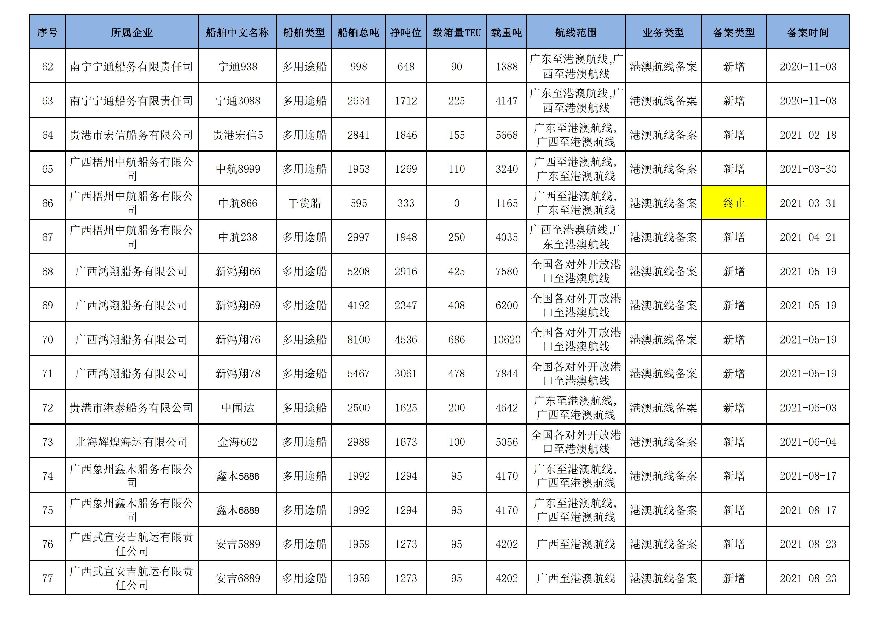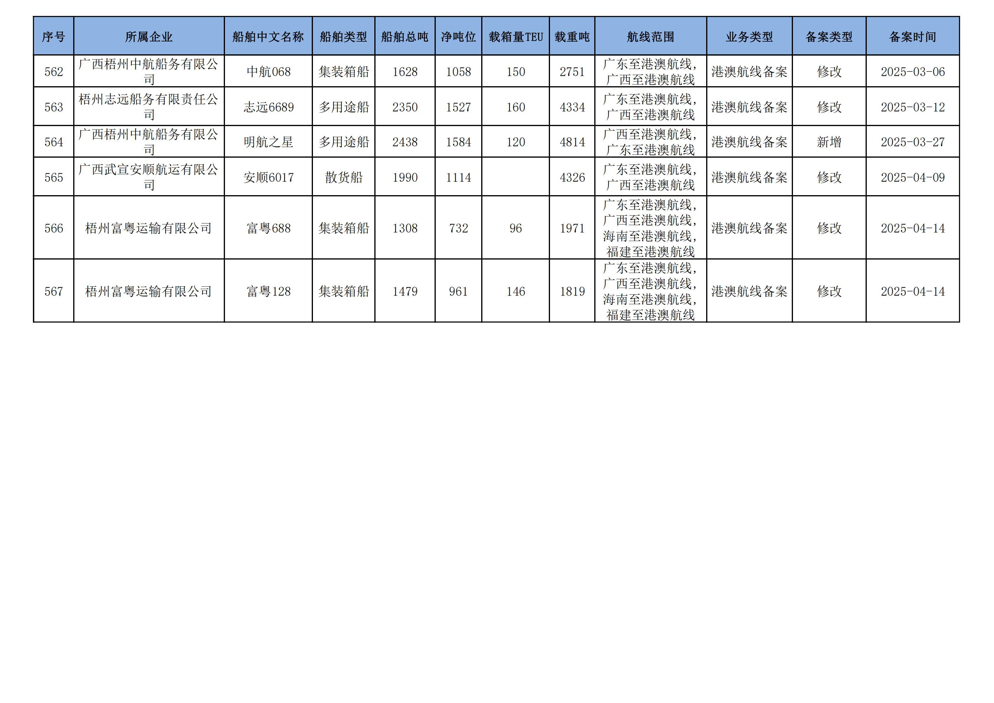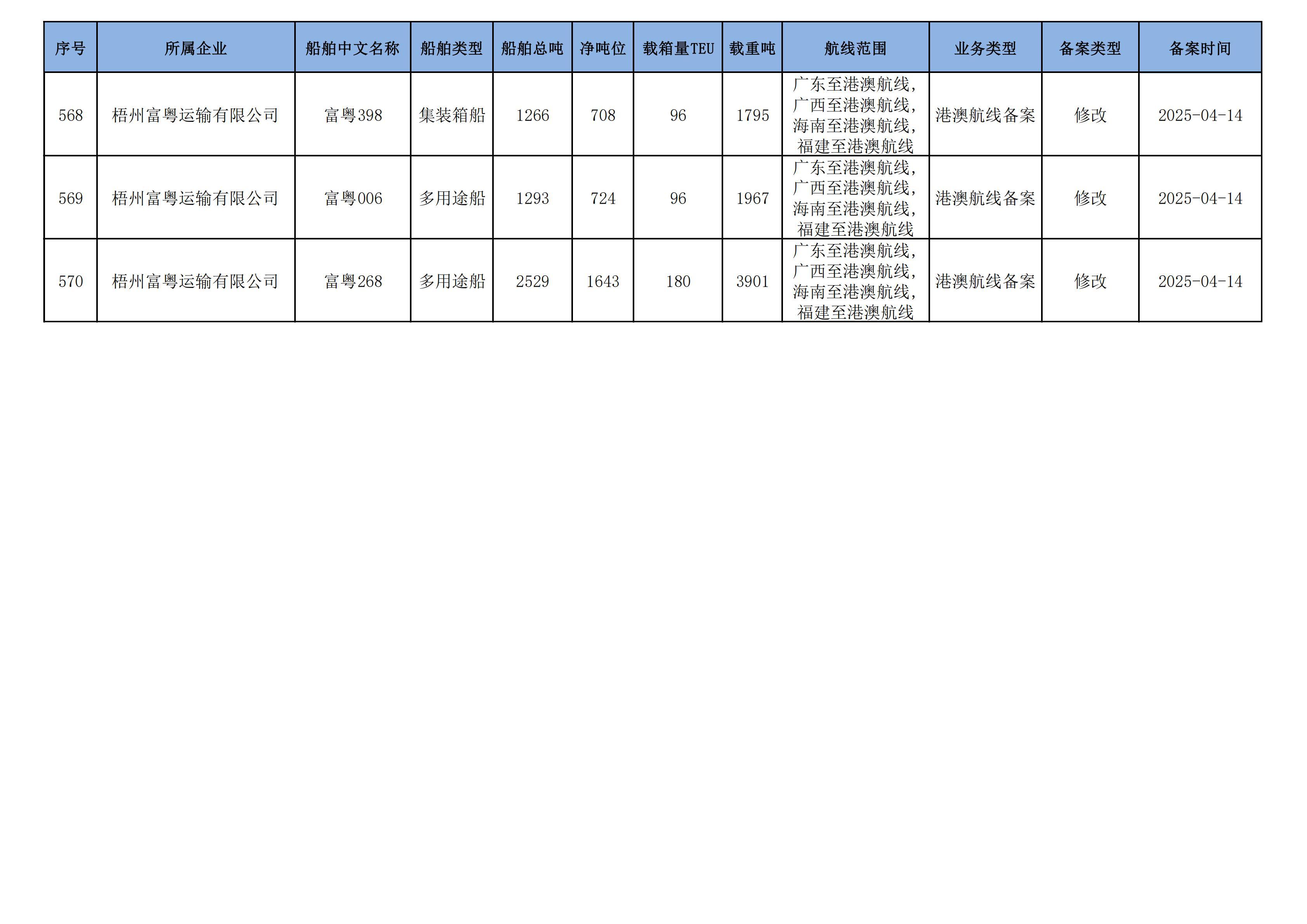 截至2025年5月12日在交通运输部水路运输建设综合管理信息系统完成备案的港澳航线水路运输船舶