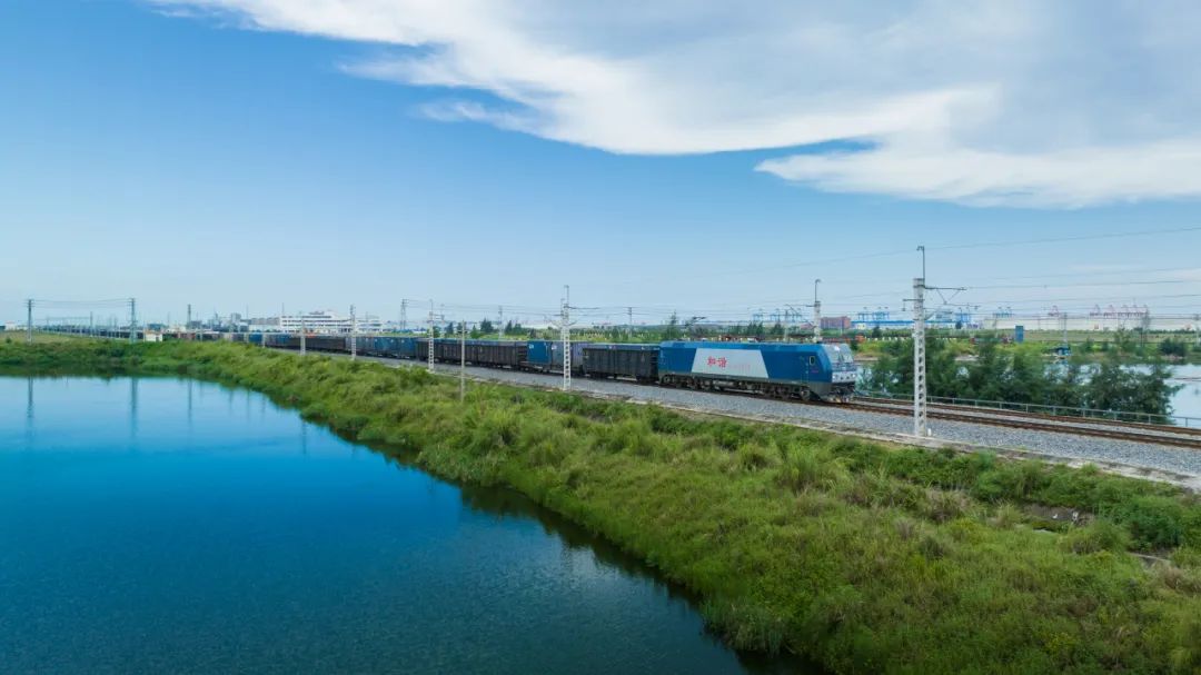 满载货物的西部陆海新通道铁海联运班列驶出钦州港东站。(陈磊 摄)
