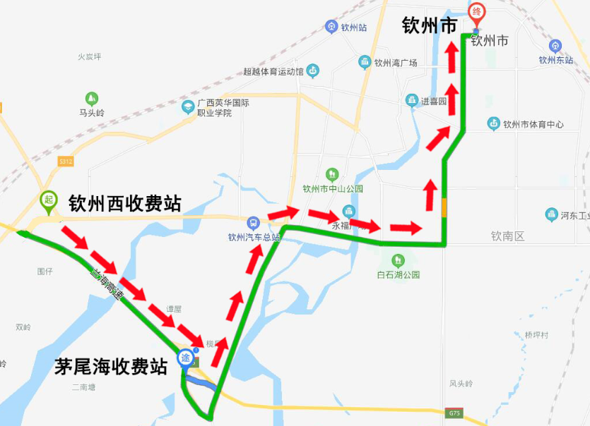 2.从良庆南互通立交→玉洞西收费站→那马北互通立交匝道往G75兰海高速防城港、钦州、北海方向行驶。