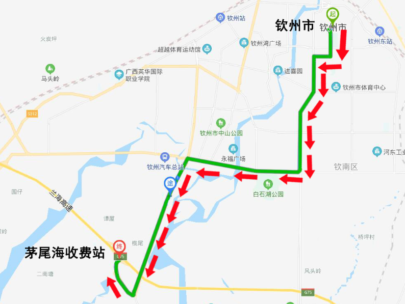 5.中马园区收费站拥堵时:往钦州港方向的车辆→金桔收费站出口→G325国道→黎合江大转盘→钦州港二级公路→钦州港收费站G75国道→北海→南北互通→中马园区收费站入口;往六景方向的车辆→钦州港→钦州→进港大道→黎合江大转盘→二级公路合浦→G325国道→金桔收费站入口→黎合江转盘→钦陆一级公路→陆屋镇→久隆收费站入口。
