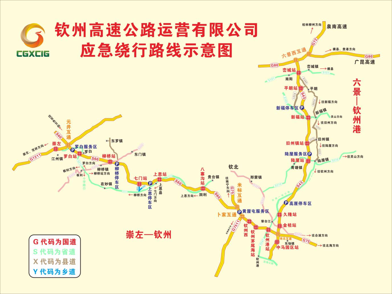 2.上思收费站拥堵时:往崇左方向的车辆→上思收费站出口→311省道→上思县城、七门乡→七门收费站入口→崇左市;往钦州方向的车辆→七门收费站出口→311省道→上思县城团结路→上思收费站入口→钦州市。