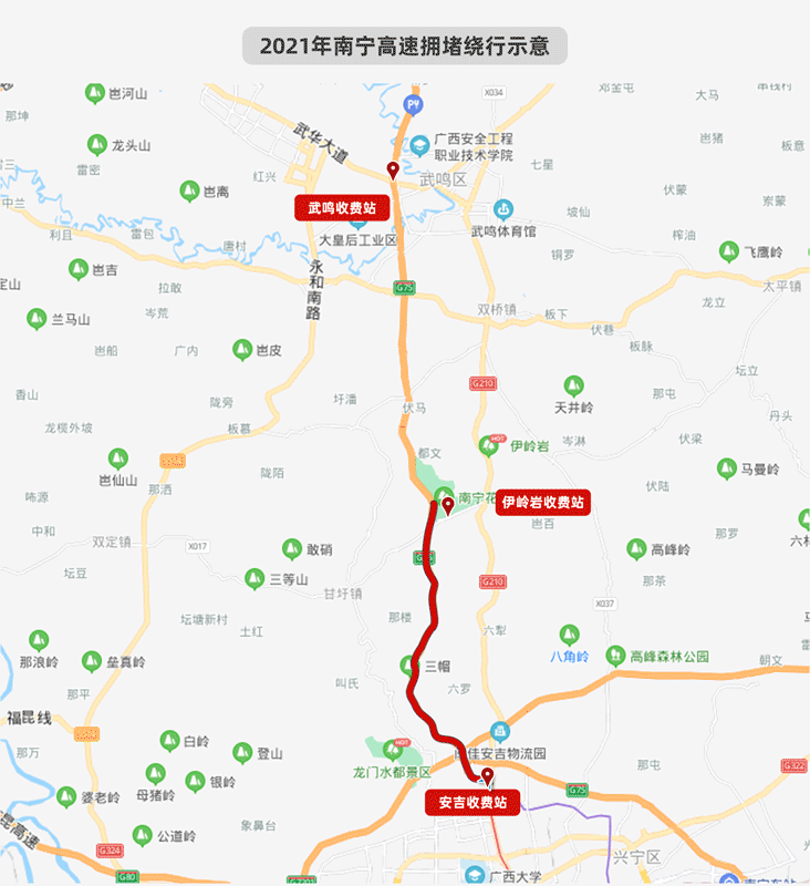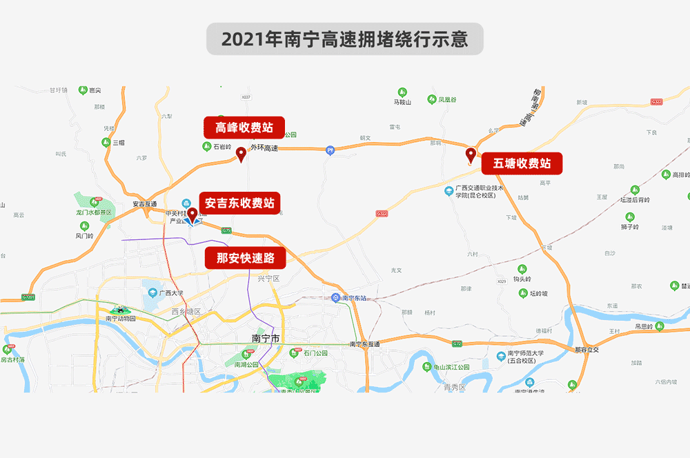 进城:可选择绕开石埠收费站,从安吉东、高峰收费站、玉洞西收费站进入南宁市区