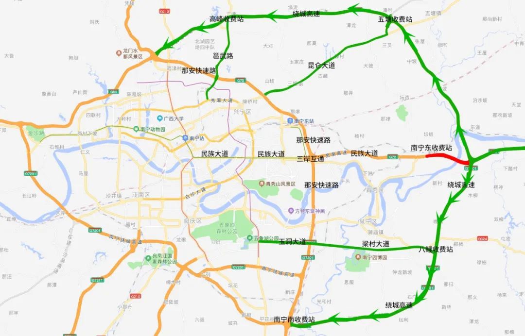 进城:可选择绕开南宁东收费站,从G72柳南高速那容互通→G7201南宁绕城高速往北海方向行驶→八鲤收费站出站→玉洞大道前往邕宁区、良庆区、五象新区、青秀区;从G72柳南高速那容互通→G7201南宁绕城高速往河池、百色行驶→五塘收费站出站→昆仑大道前往兴宁区、青秀区凤岭北片区、高新区、西乡塘区;选择高峰收费站→邕武路前往兴宁区、高新区。