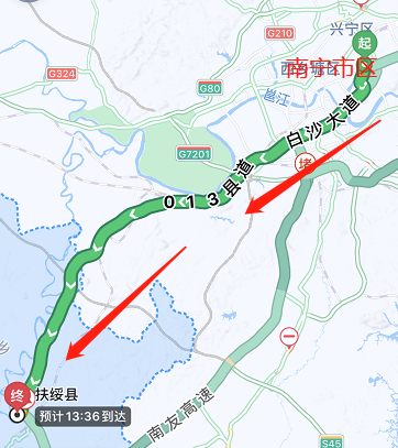 9、G7211南友高速吴圩至扶绥段发生拥堵时:南宁市区→白沙大道→013县道→目的地。