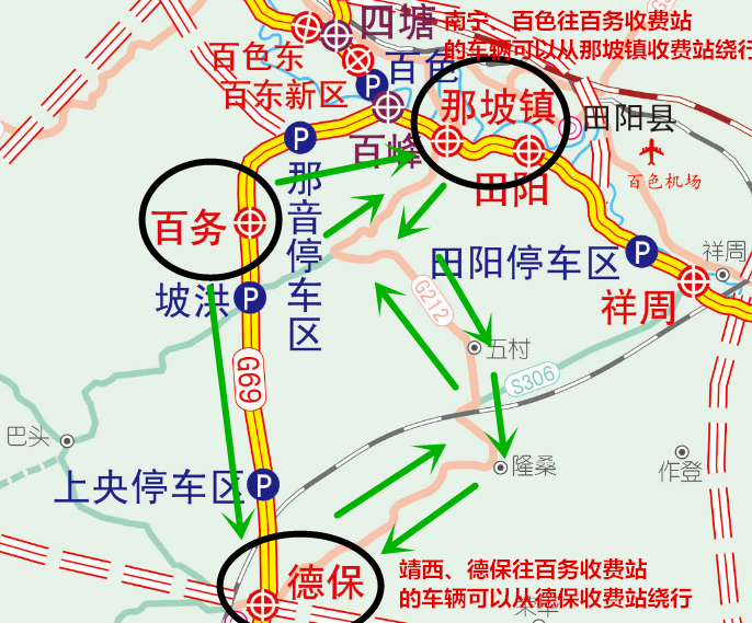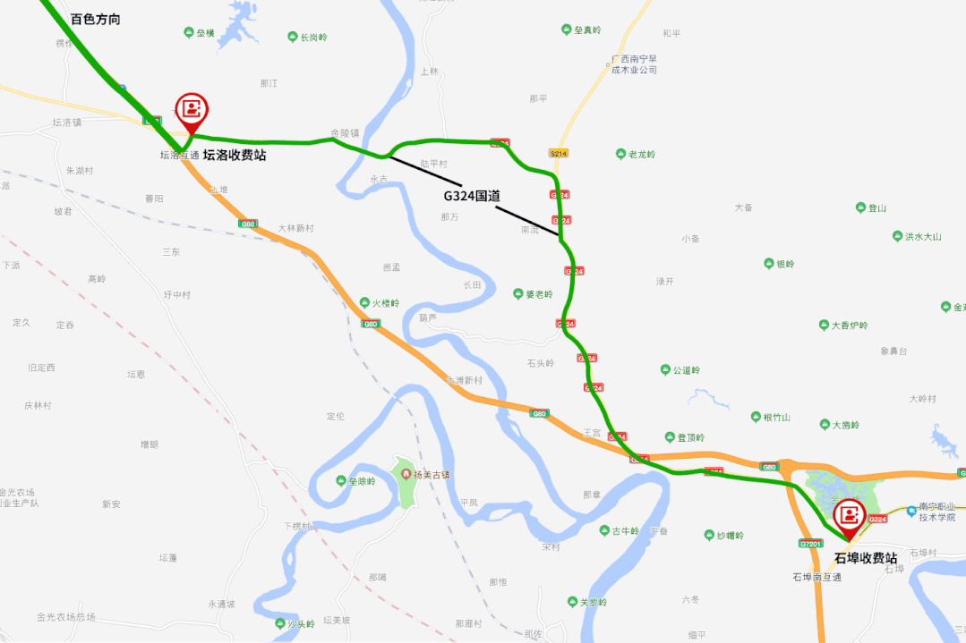 G80广昆高速坛百段←→那坡镇收费站或田阳收费站或田东收费站或思林镇收费站←→G324国道←→目的地。