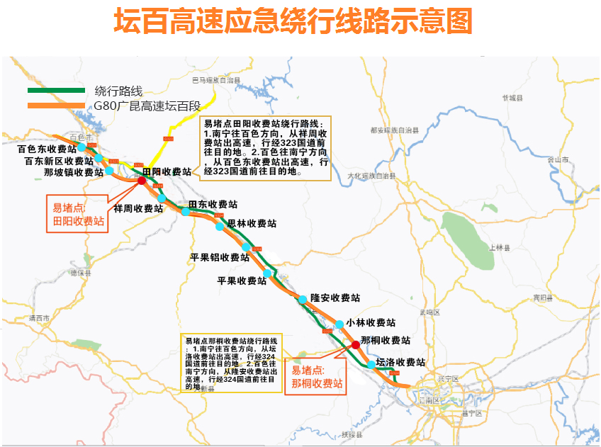 1、G80广昆高速坛百段:祥周、田阳收费站;
