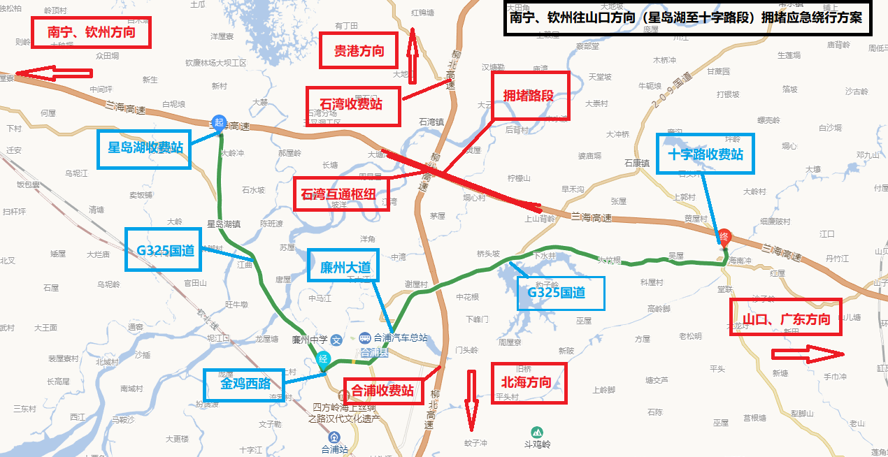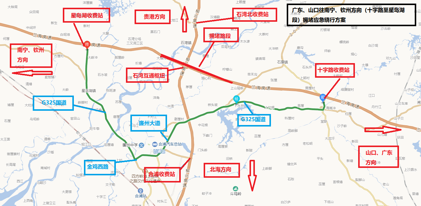 (1)南宁、钦州往山口、广东方向(星岛湖至十字路段)拥堵应急绕行方案