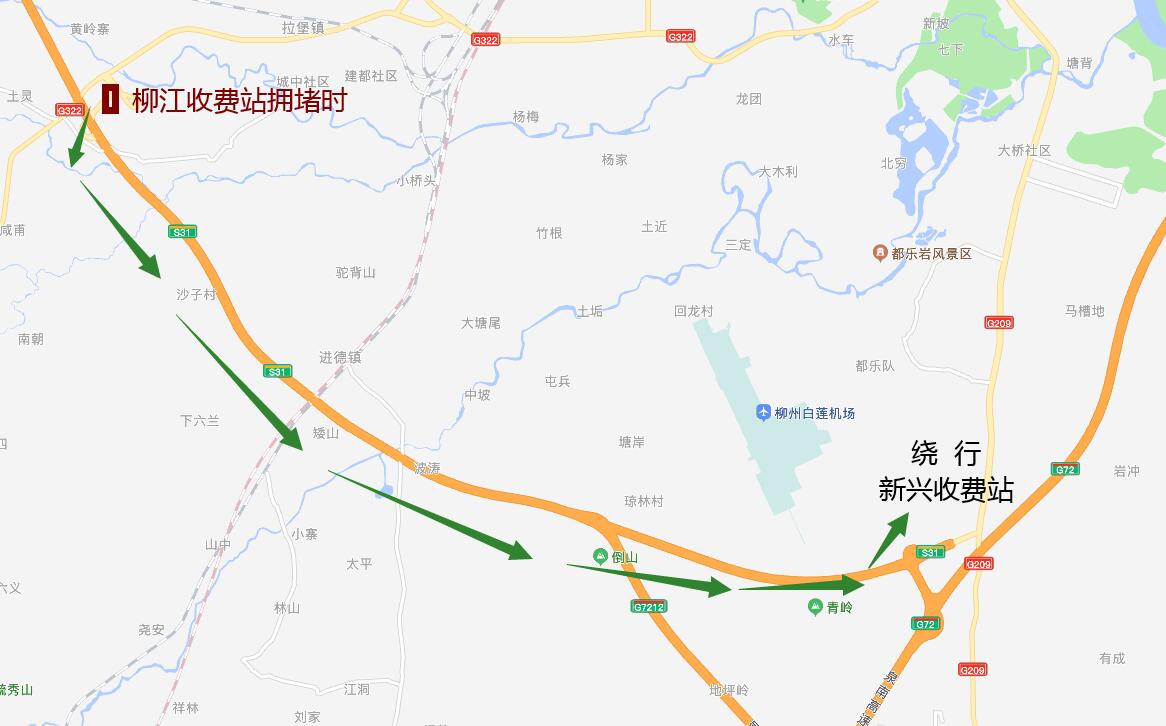 出站绕行一方案:G72线泉南高速→新兴互通立交→S31三北高速→柳江收费站;