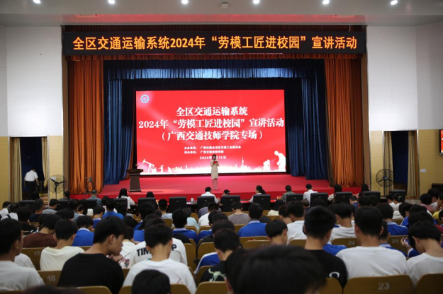 南宁讯(通讯员 黄丽琳 摄影报道)为进一步弘扬劳模精神、劳动精神、工匠精神,引领学校师生凝聚思想共识,汲取奋进力量,9月12日,全区交通运输系统2024年“劳模工匠进校园”宣讲活动走进广西交通技师学院。