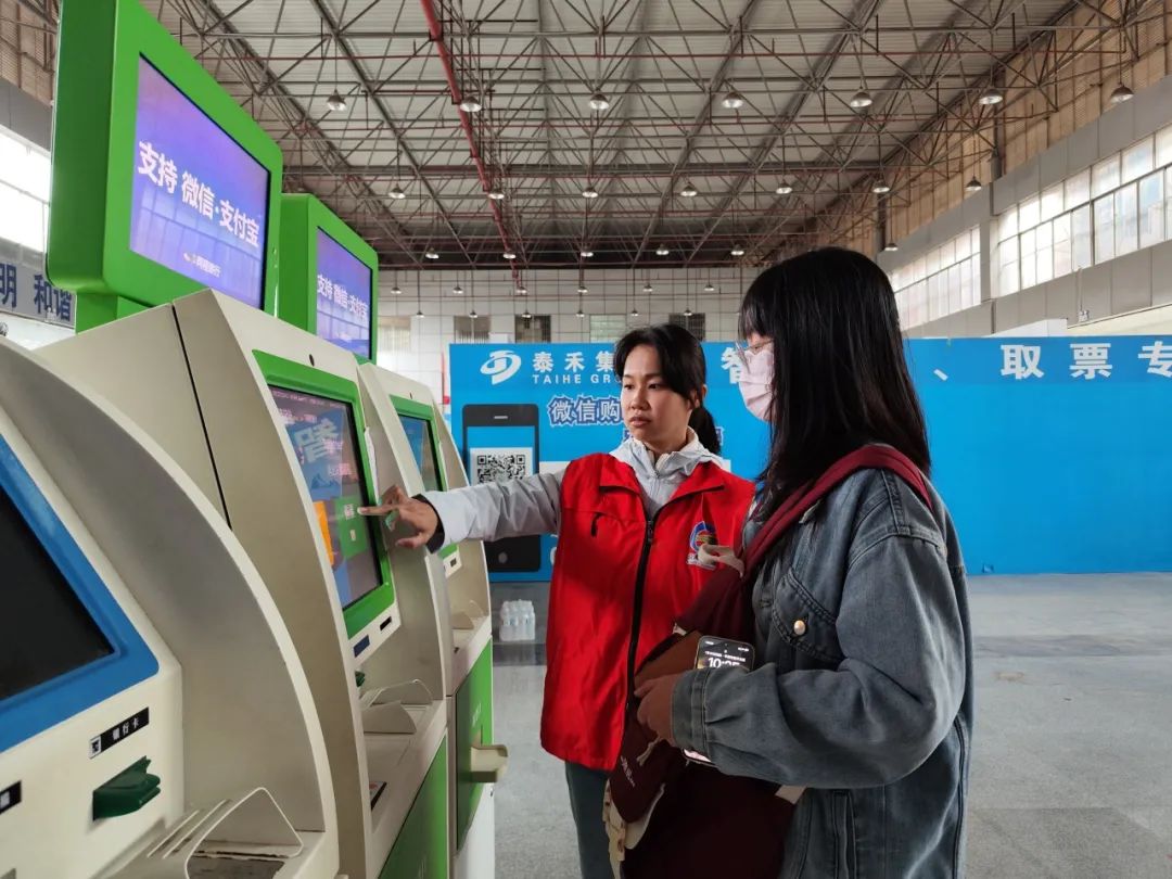浦北公路养护中心团支部青年团员协助旅客购票。(黄森 摄)