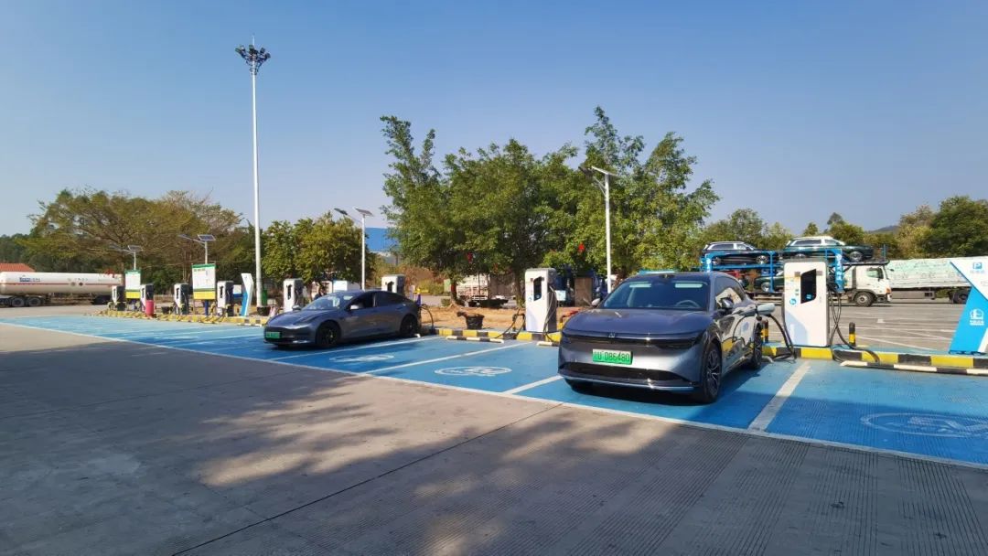 新能源汽车在广贺高速白马服务区内充电。(赵桂芳 摄)