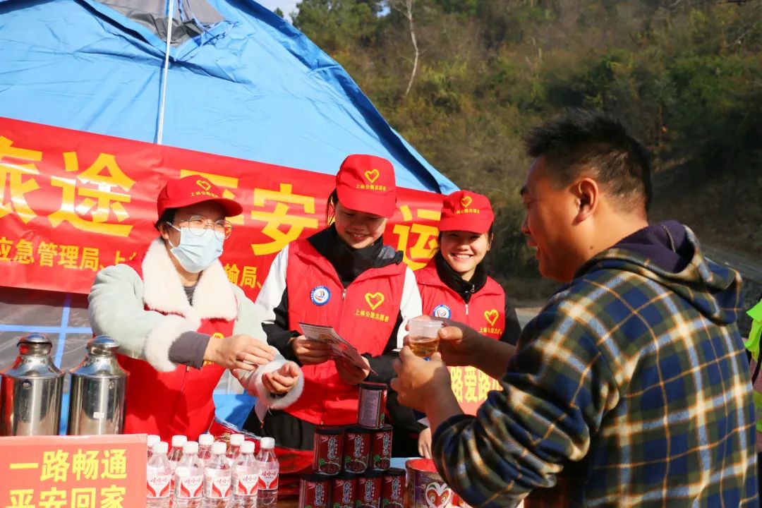 上林公路养护中心青年志愿者为旅客送上暖心姜糖水。(黄幼玲 摄)