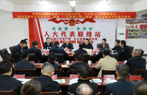 在小长安镇河池港·牛毕村人大代表联络站民情沟通会上,刘可深入了解罗城仫佬族自治县经济社会发展情况,并与基层人大代表和群众代表进行面对面交流,组织相关部门现场回应群众意见建议。