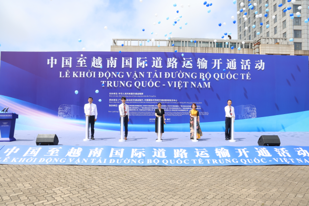 中方(交通运输部、广西壮族自治区人民政府)、越方、亚行代表共同宣布中国至越南国际道路运输线路开通,下达发车指令。