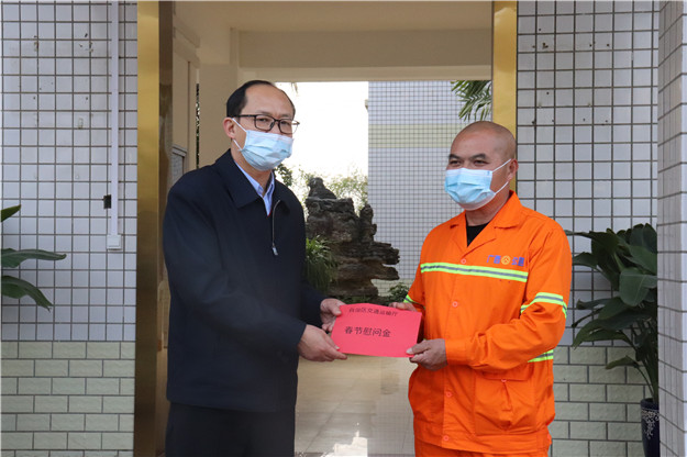 陆晓明为兴宾公路养护中心劳动模范送上慰问金。