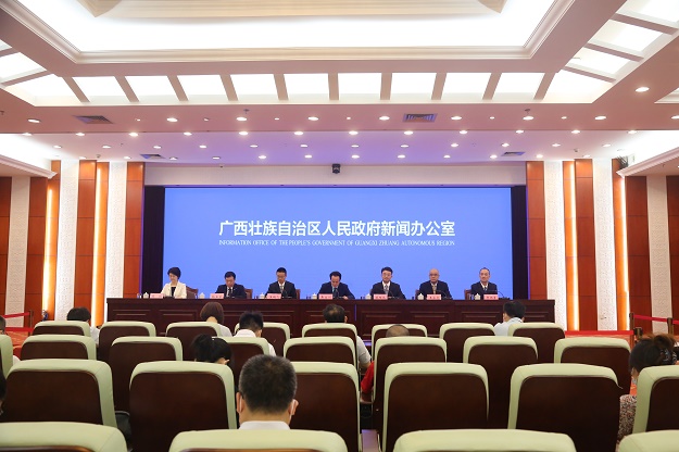 7月21日,广西高水平建设西部陆海新通道新闻发布会在南宁召开。自治区发展改革委党组成员、副主任黄文川,樱桃直播 党组成员欧阳斌,自治区商务厅党组成员王鹏飞,自治区北部湾办党组成员、副主任王宗文,中国人民银行南宁中心支行党委委员、副行长杨正东,中国铁路南宁局集团有限公司总调度长贾顺勇出席发布会并答记者问。自治区政府新闻办副主任薛彬主持发布会。