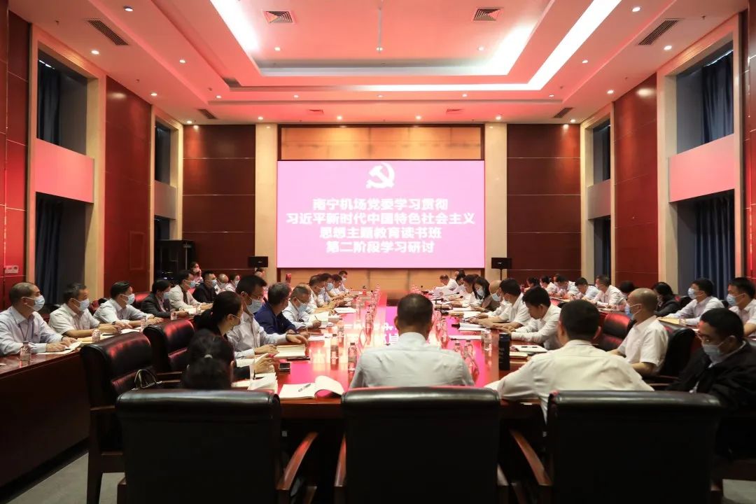 5月10日,南宁吴圩国际机场召开学习贯彻习近平新时代中国特色社会主义思想主题教育读书班第二阶段专题学习研讨会,传达了自治区党委召开的深入学习贯彻习近平总书记对广西“五个更大”重要要求和视察广西“4·27”重要讲话精神座谈会的有关精神,要求全体党员干部要始终做到用重要讲话精神武装头脑、用重要讲话精神指导实践、用重要讲话精神创新局面、用重要讲话精神为民造福。