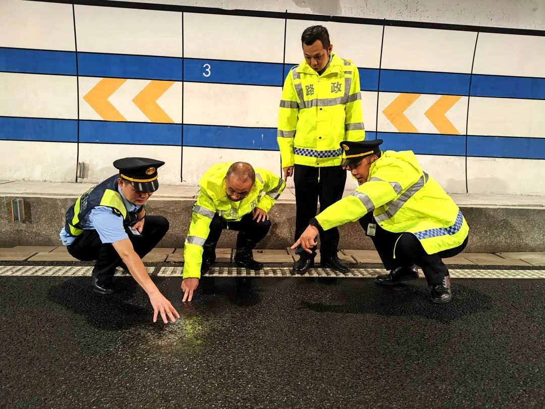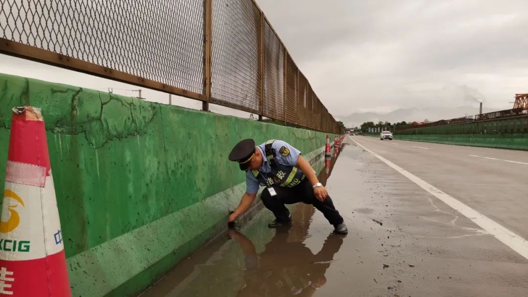 执法人员检查桥面排水情况。