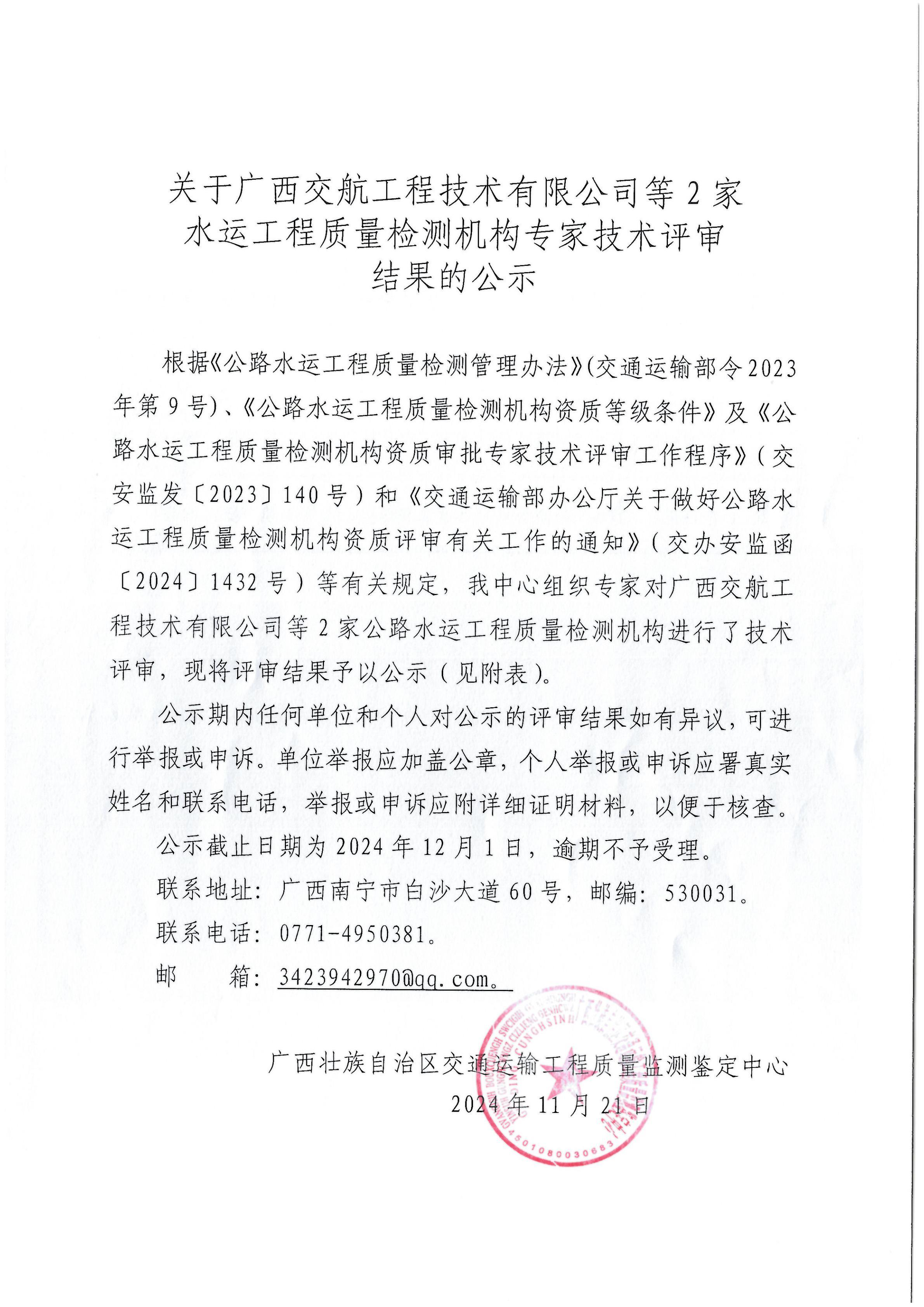 关于广西交航工程技术有限公司等2家水运工程质量检测机构专家技术评审结果的公示