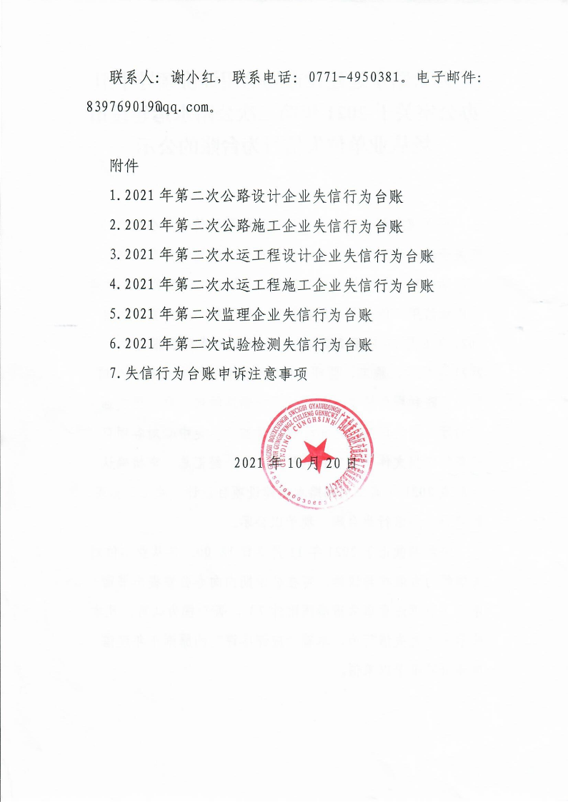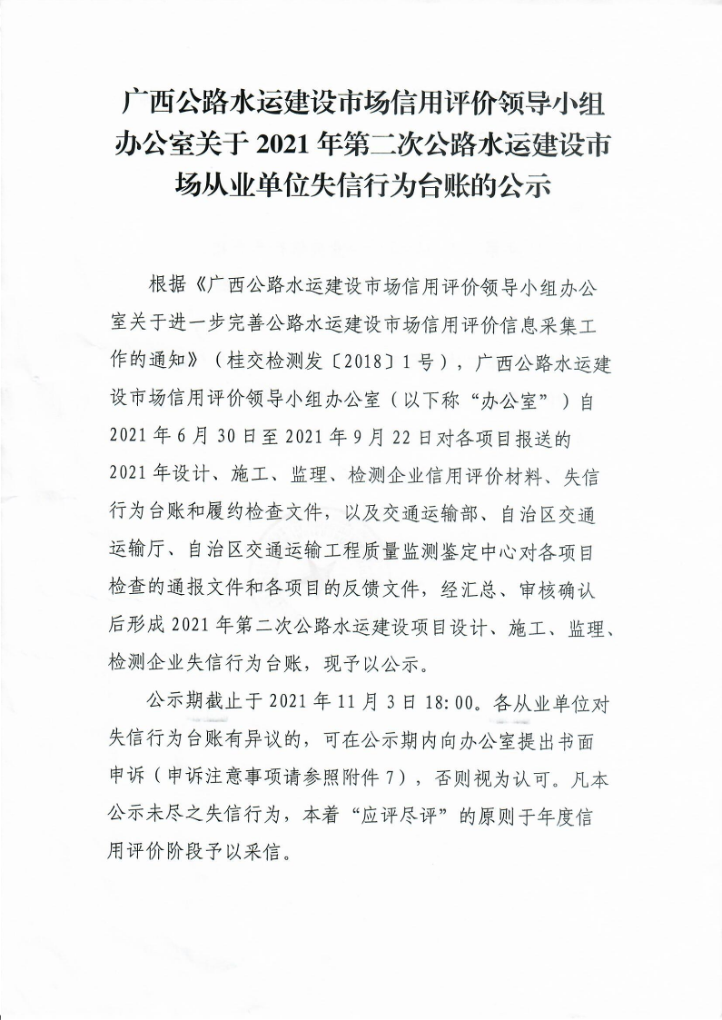 关于2021年第二次公路水运建设市场从业单位失信行为台账的公示