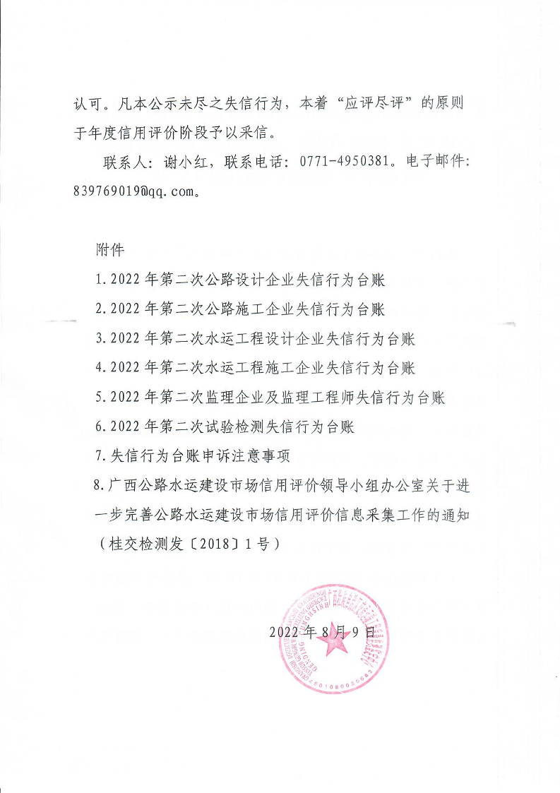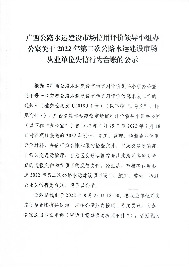广西公路水运建设市场信用评价领导小组办公室关于2022年第二次公路水运建设市场从业单位失信行为台账的公示