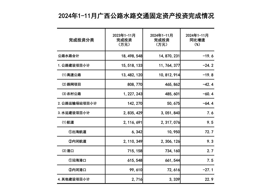 2024年1-11月广西公路水路交通固定资产投资完成情况