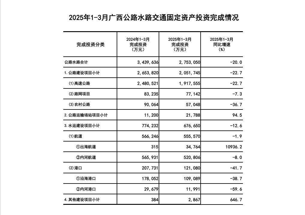 2025年1-3月广西公路水路交通固定资产投资完成情况