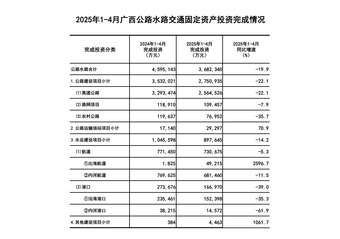 2025年1-4月广西公路水路交通固定资产投资完成情况