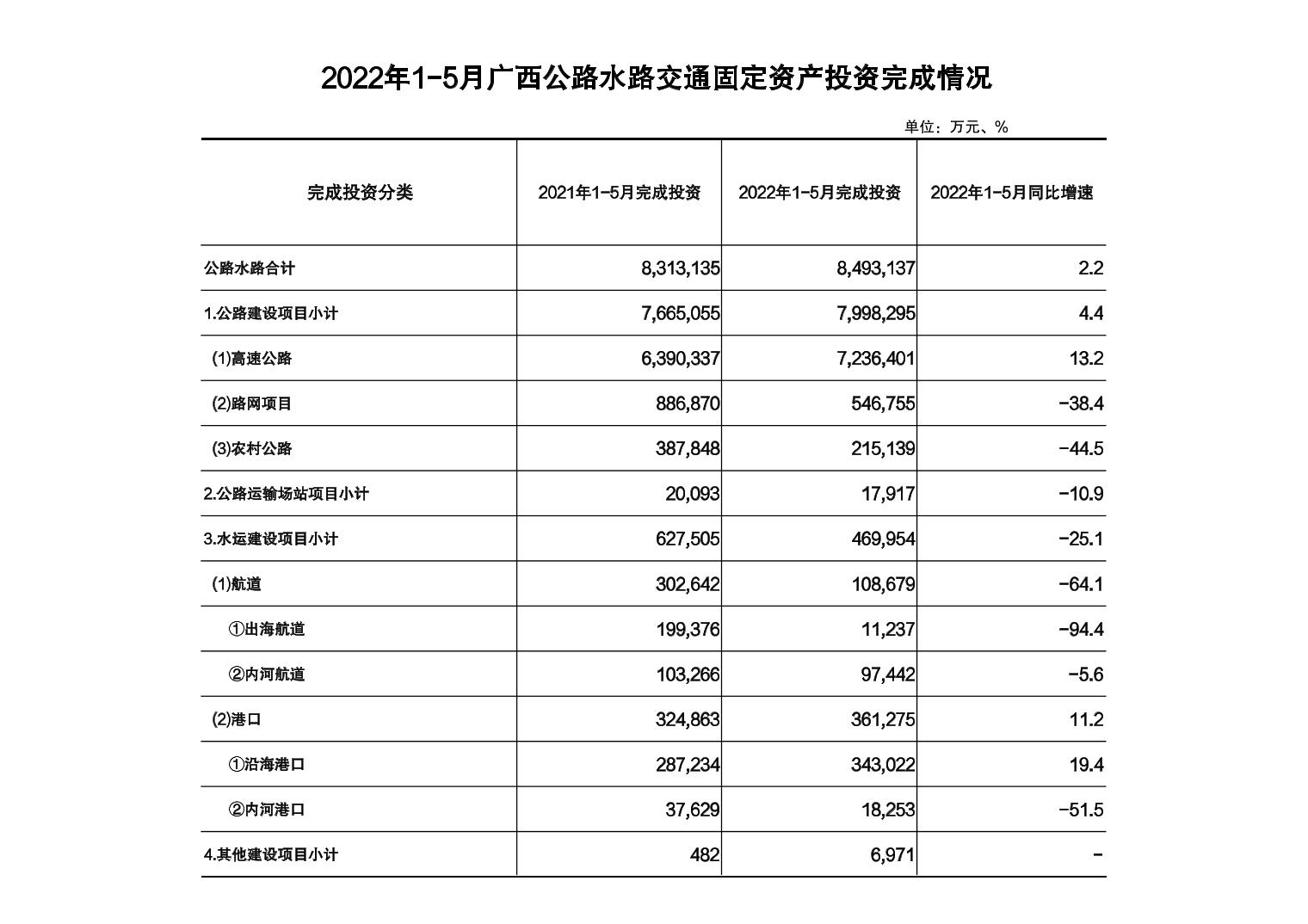 2022年1-5月广西公路水路交通固定资产投资完成情况