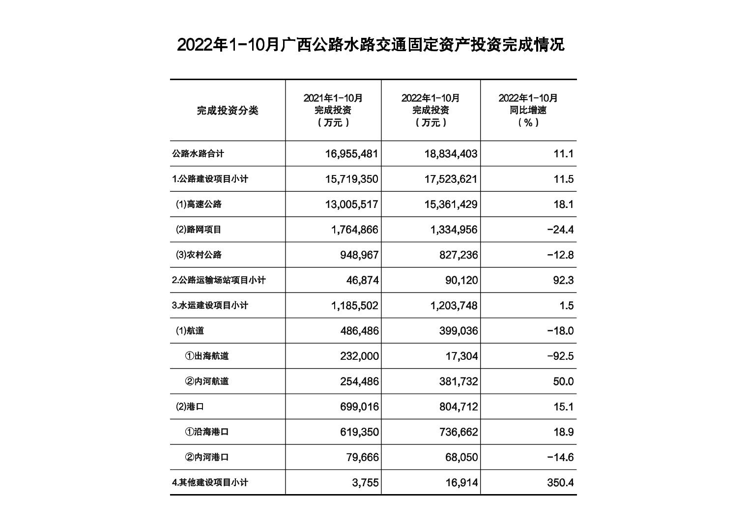 2022年1-10月广西公路水路交通固定资产投资完成情况
