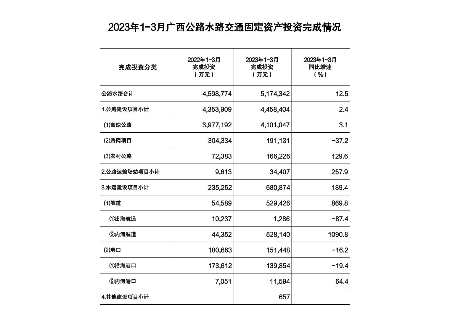 2023年1-3月广西公路水路交通固定资产投资完成情况