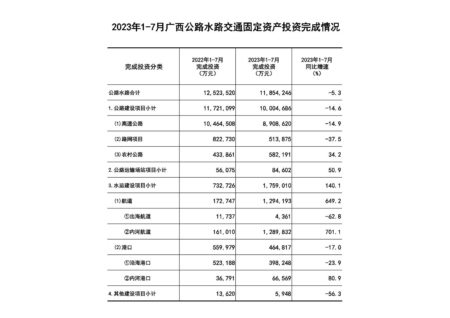 2023年1-7月广西公路水路交通固定资产投资完成情况