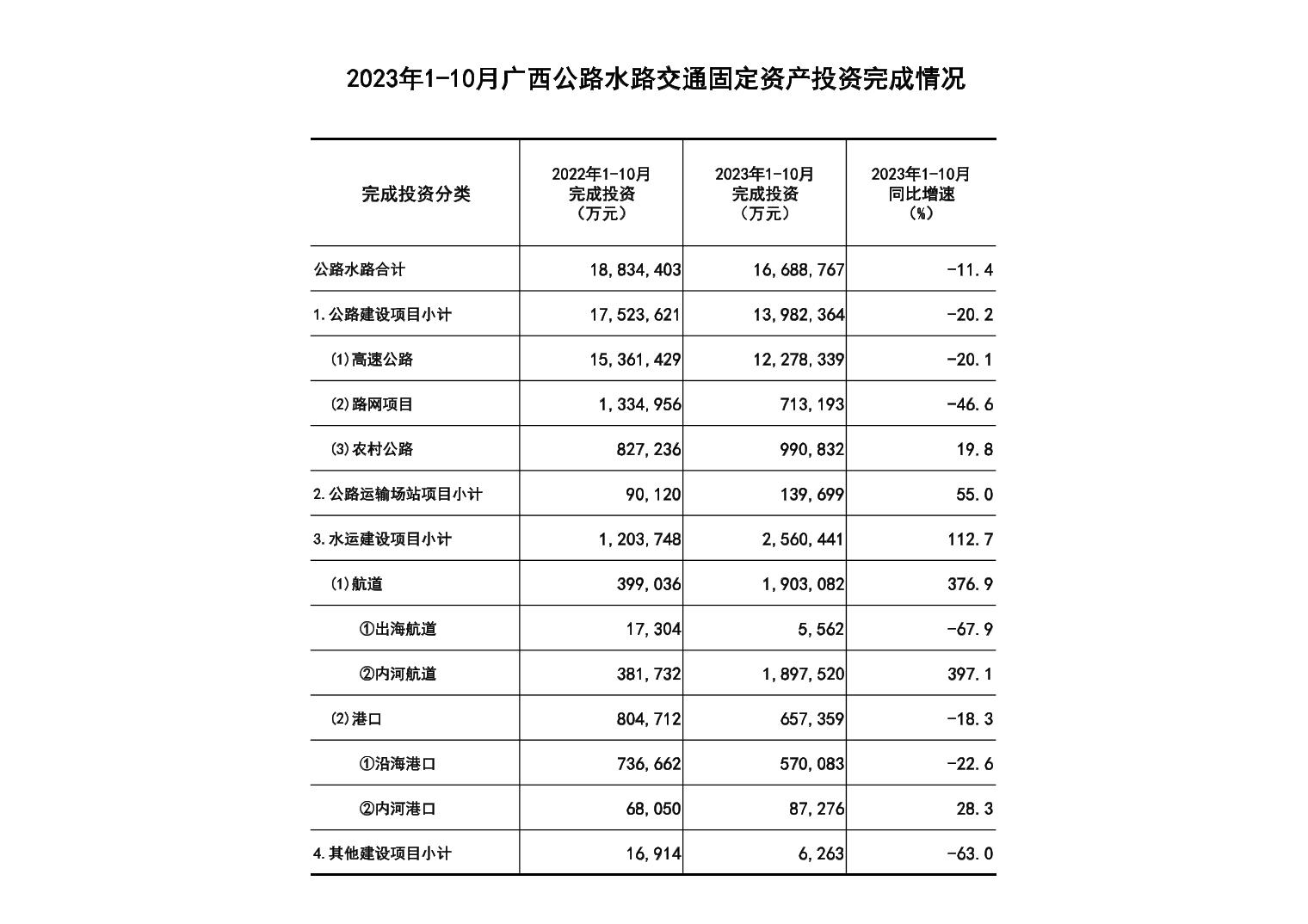 2023年1-10月广西公路水路交通固定资产投资完成情况