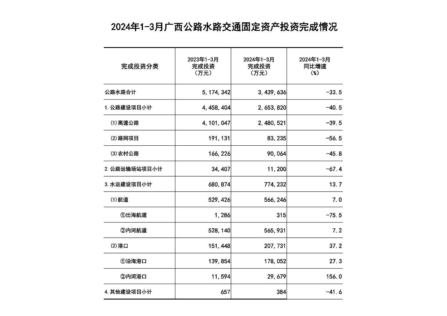 2024年1-3月广西公路水路交通固定资产投资完成情况