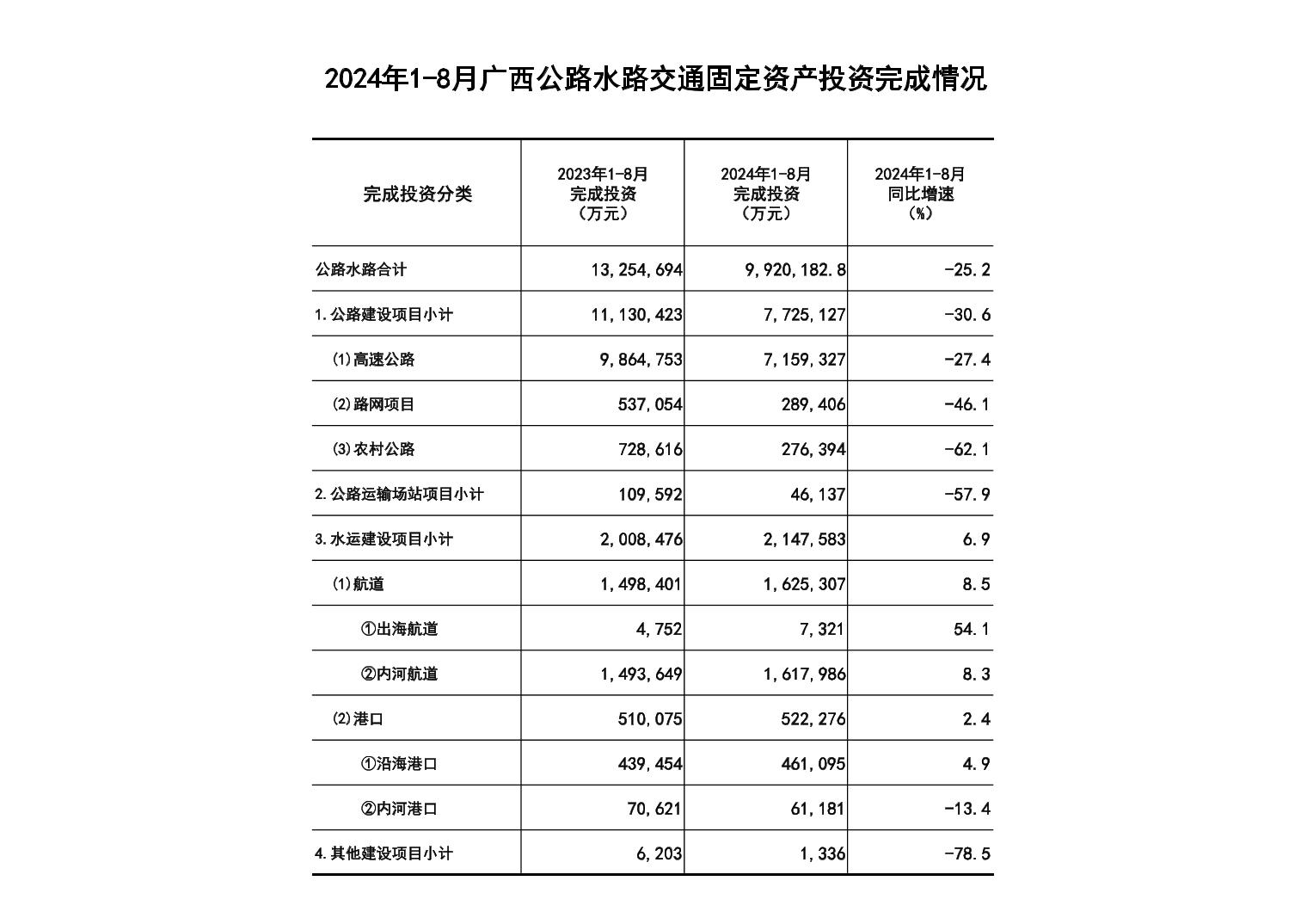 2024年1-8月广西公路水路交通固定资产投资完成情况