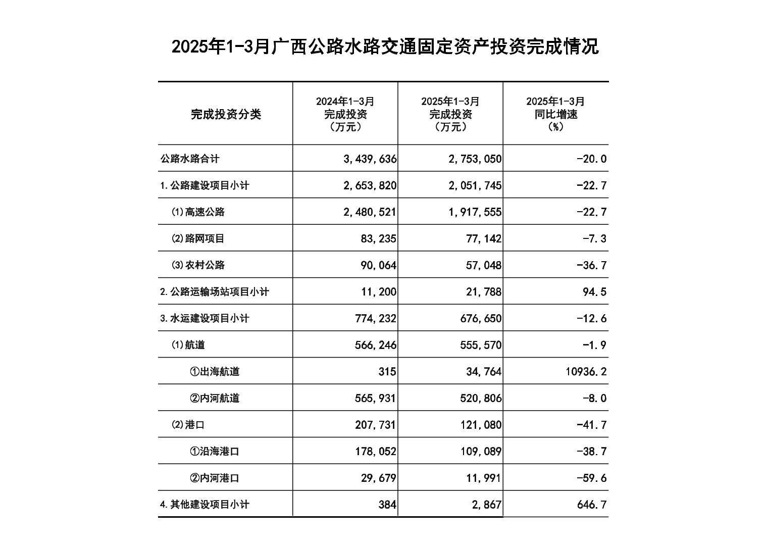 2025年1-3月广西公路水路交通固定资产投资完成情况